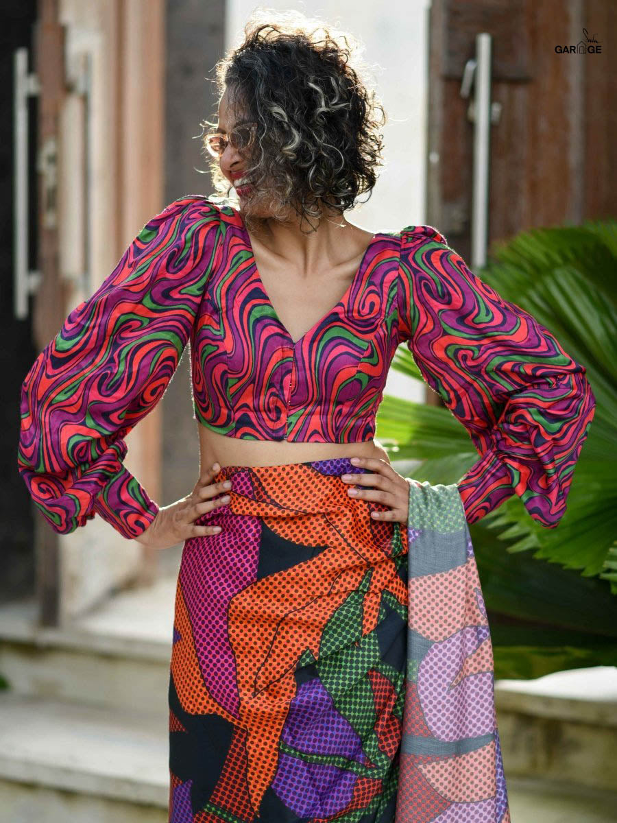 Ta, the model is wearing sizes blouse and saree is Flower FrecklesPhool Patti