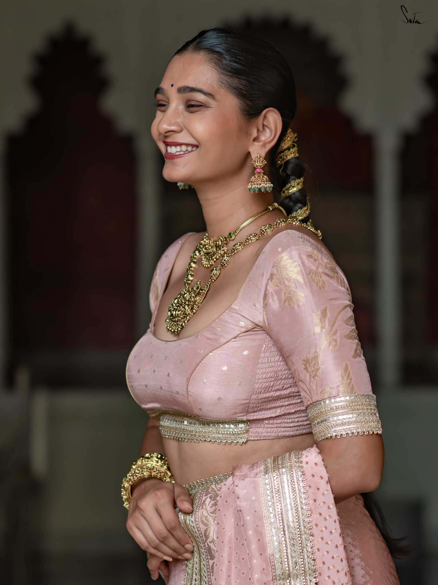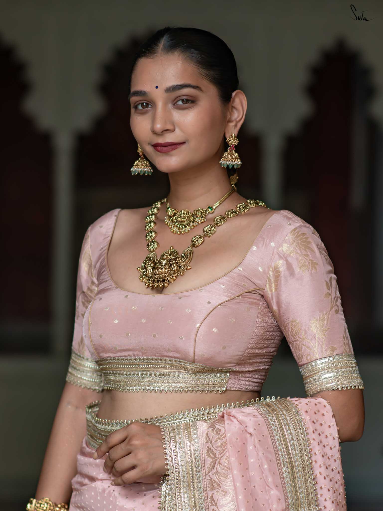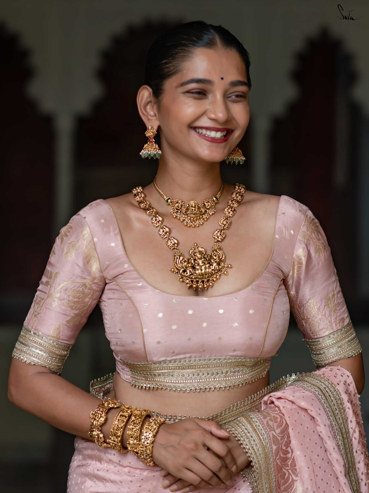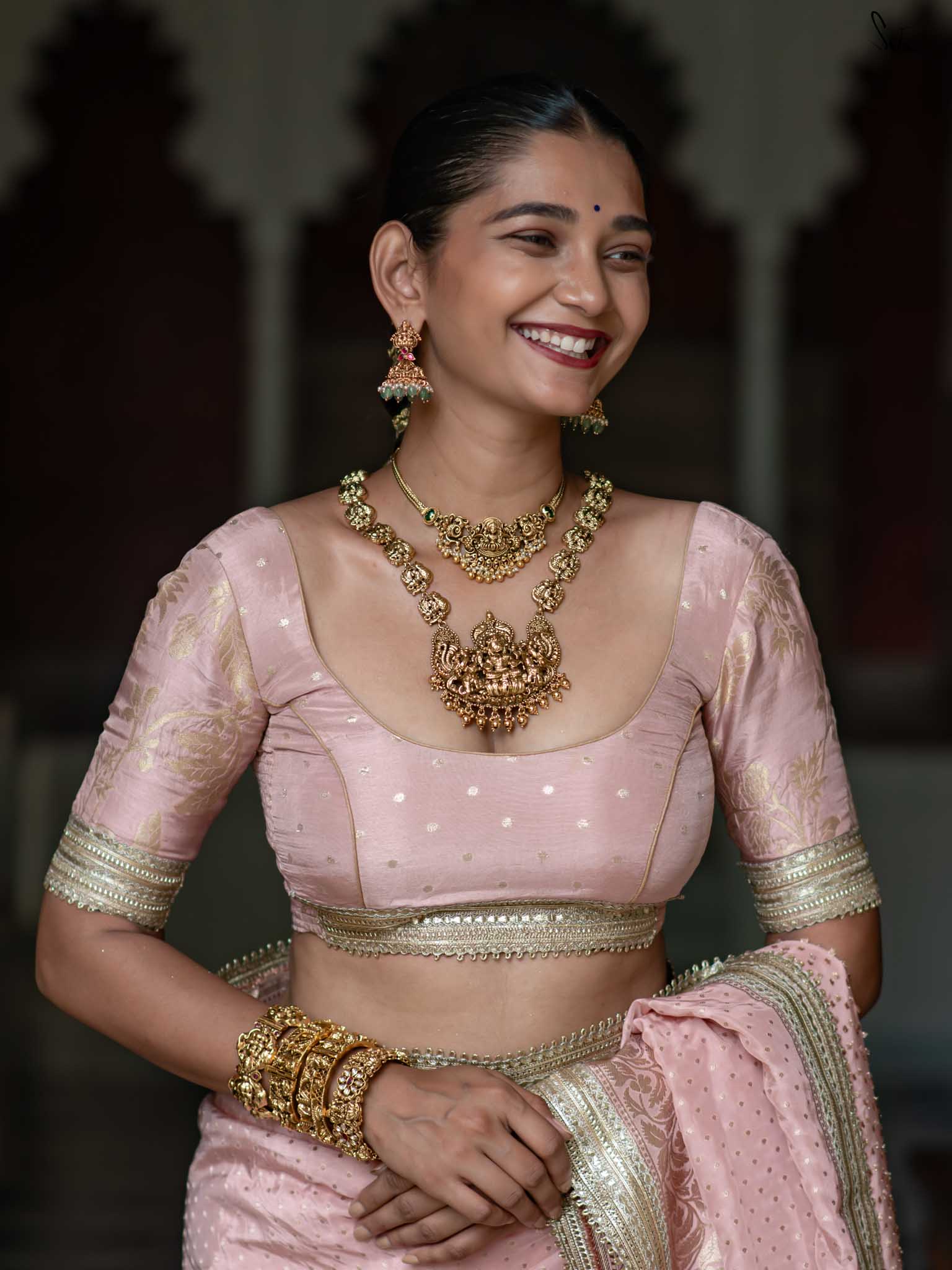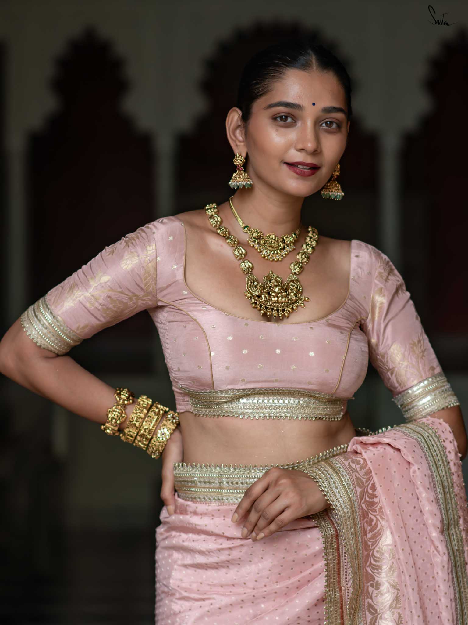 Soft peach with a celebratory glow, Ghewar Hai is designed with a front round neck and elbow-length sleeves. The polka and floral jaal fabric, finished with embroidered lace, makes this blouse an effortless blend of comfort and elegance.