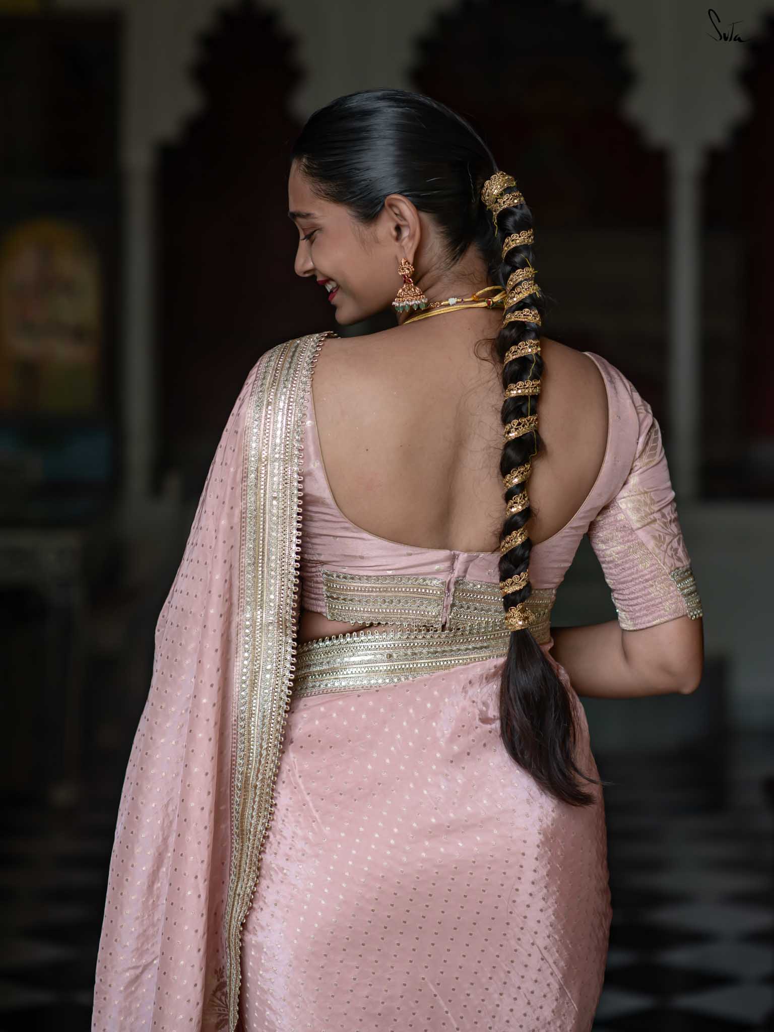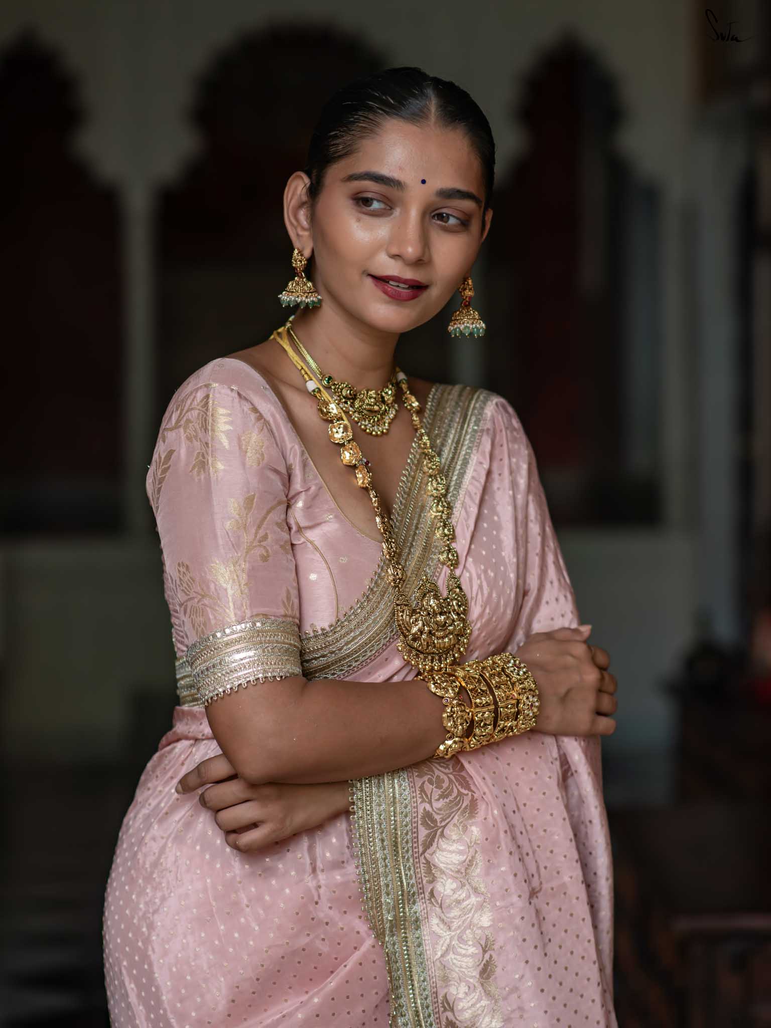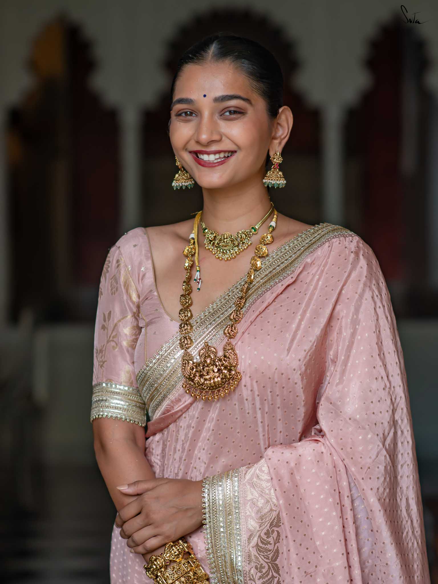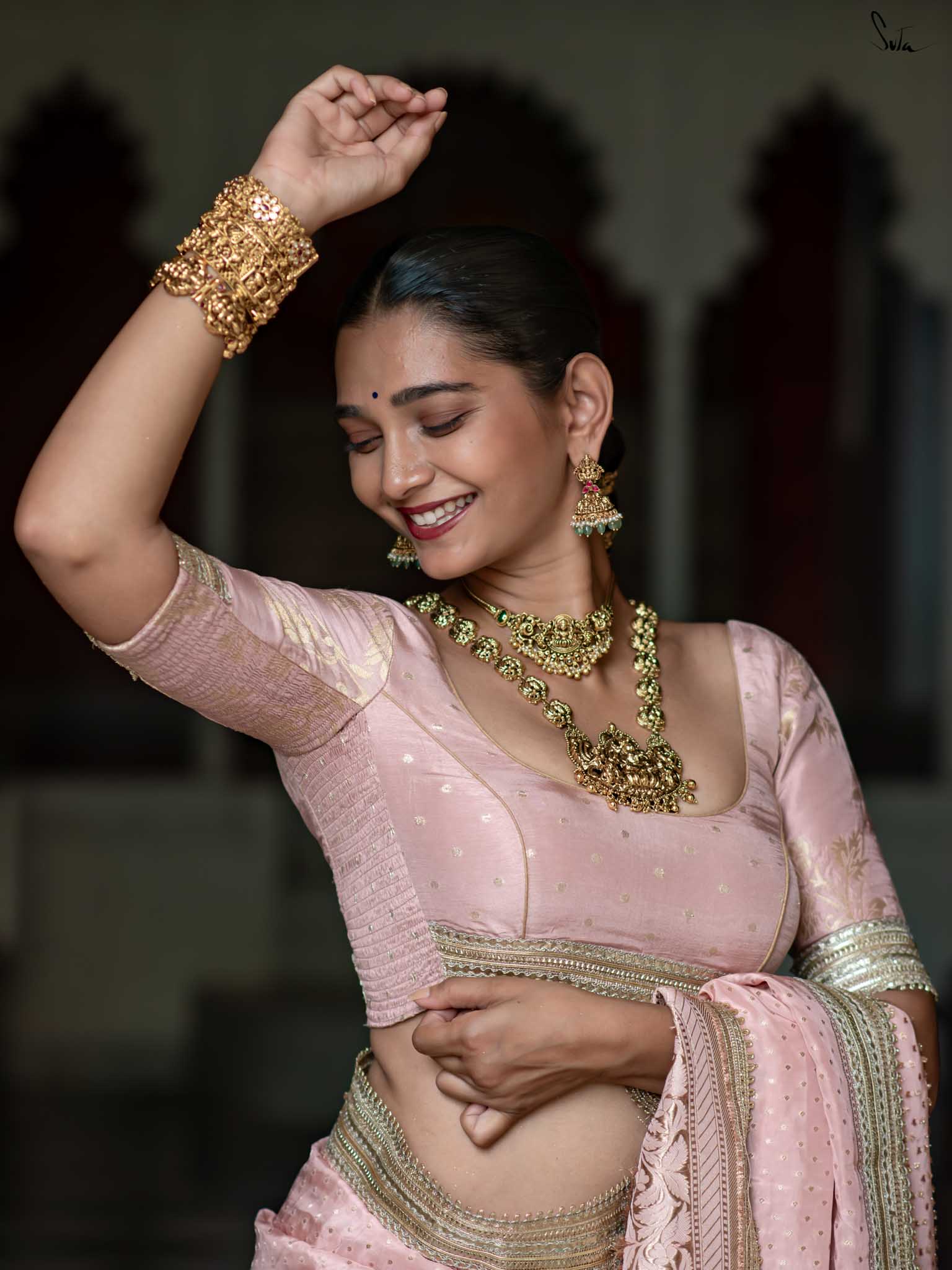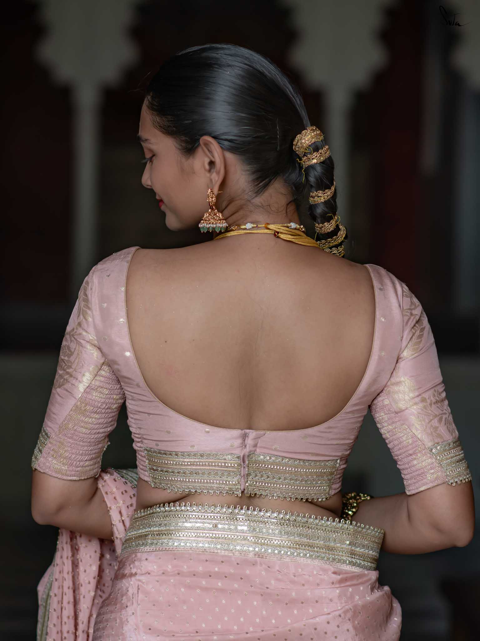 Soft peach with a celebratory glow, Ghewar Hai is designed with a front round neck and elbow-length sleeves. The polka and floral jaal fabric, finished with embroidered lace, makes this blouse an effortless blend of comfort and elegance.