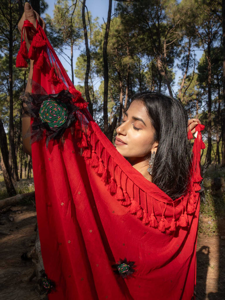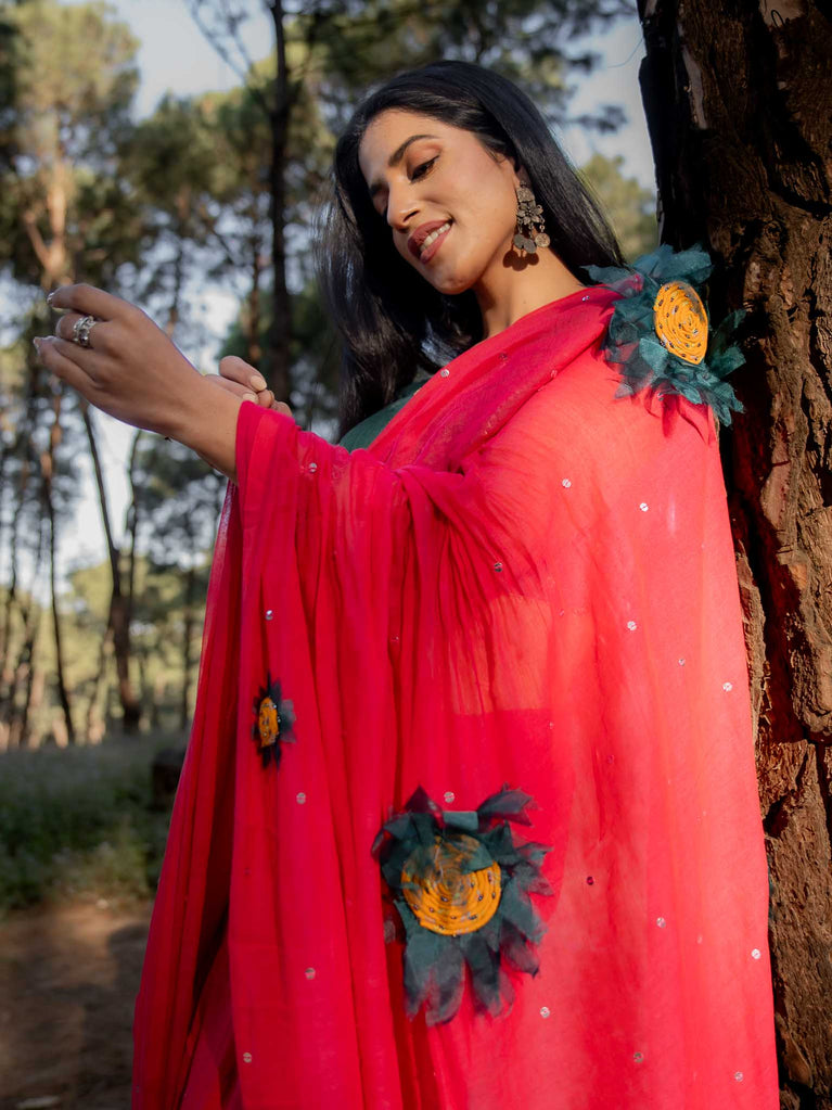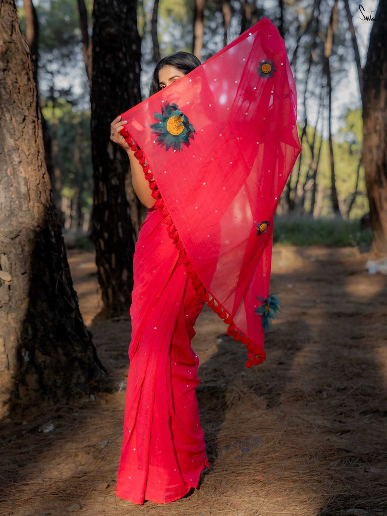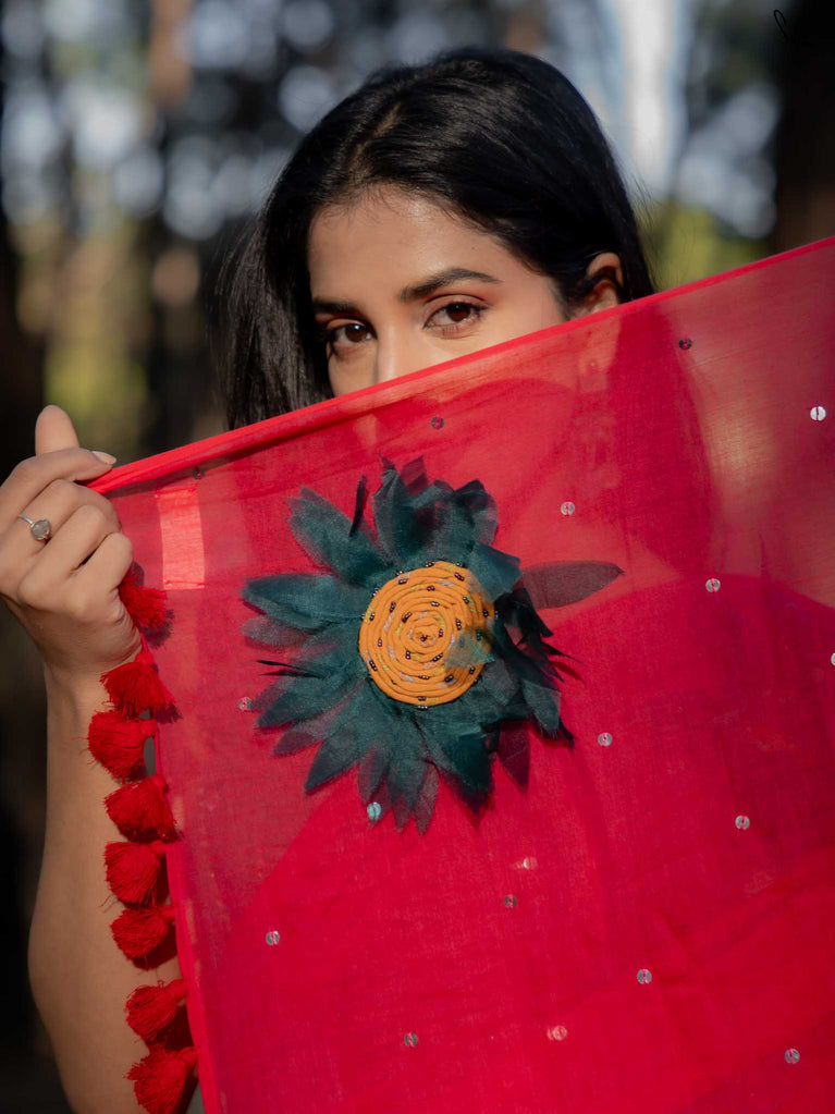 This saree is a burst of warmth woven into the softest mul cotton. The fiery red base feels like a sunset you can wear - light, breathable and oh-so-comforting against the skin.