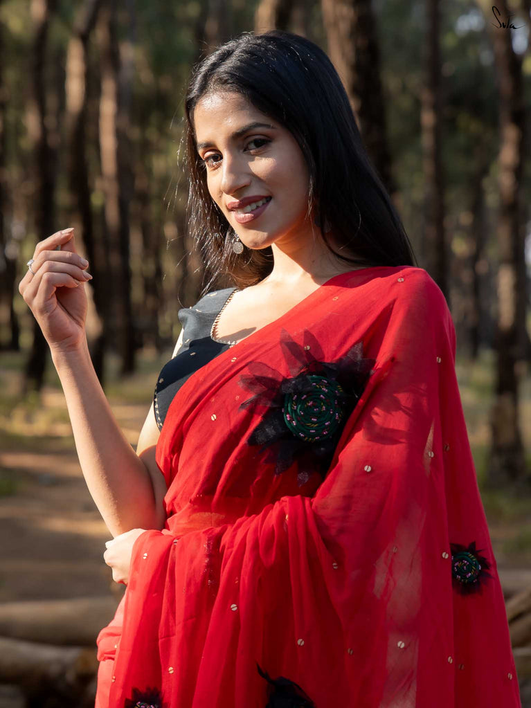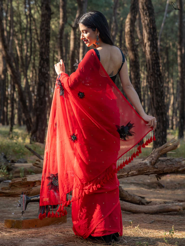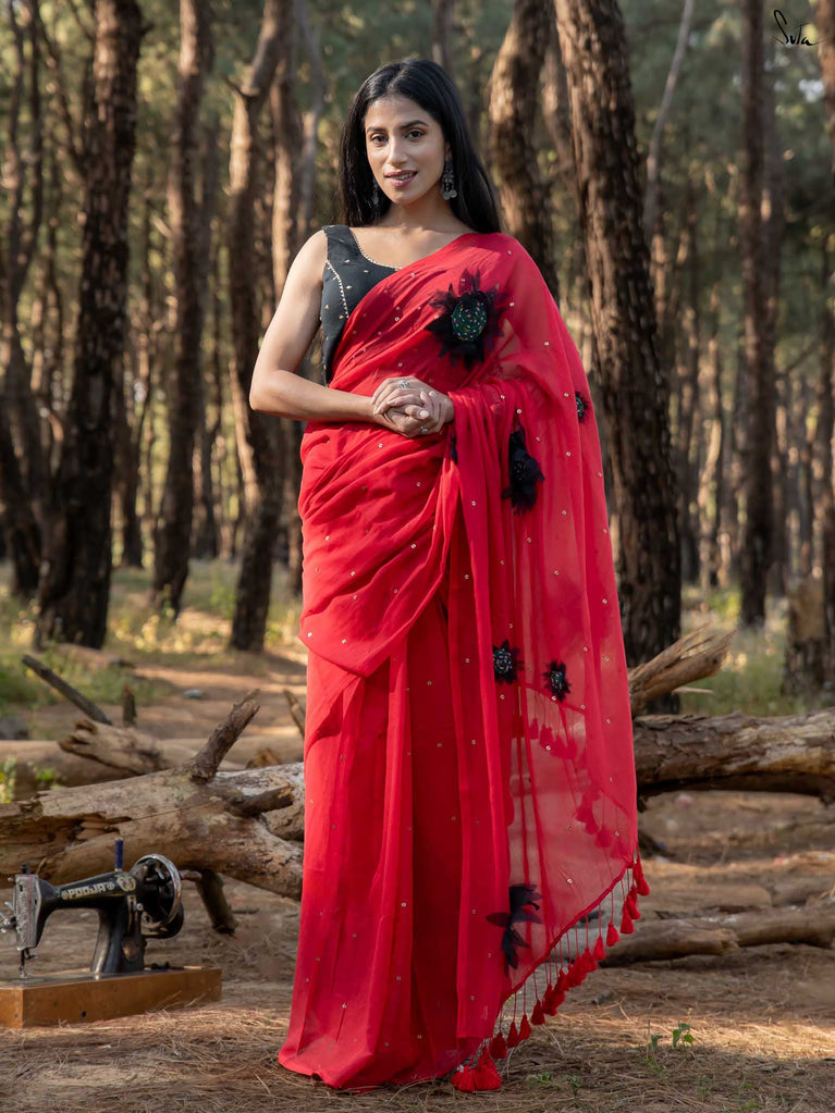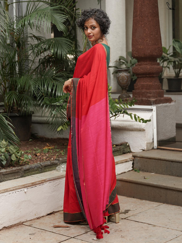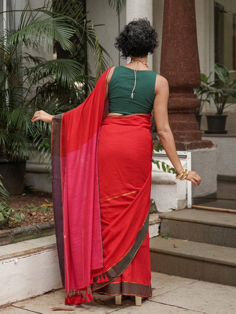 This saree is a burst of warmth woven into the softest mul cotton. The fiery red base feels like a sunset you can wear - light, breathable and oh-so-comforting against the skin.
