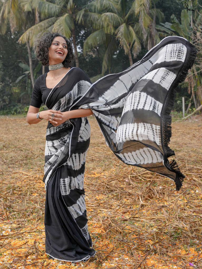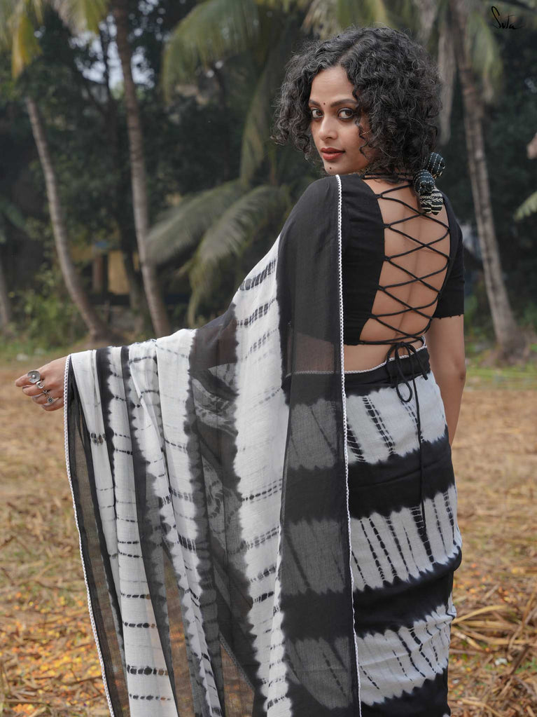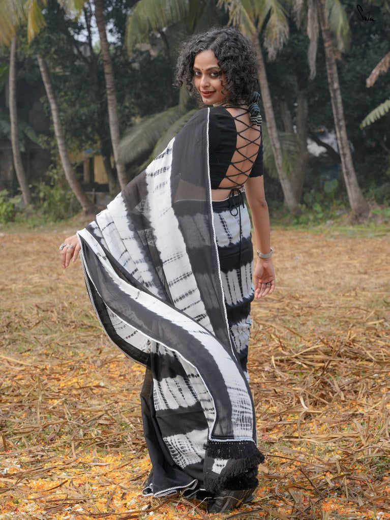 Under the moonlight, everything seems a little more magical like this black-and-white mul modal saree. Its tie-dye artistry and patchwork meet the quiet elegance of the night sky, where the stars shine in their subtle sheen. It’s a celebration of contrasts, dark and light, bold and soft capturing the essence of Holi when night falls, and the half half colors settle into the memories of the day. The lace, scalloped and soft, adds a celestial grace, while the jhalar tassels twinkle like stars in the night sky.