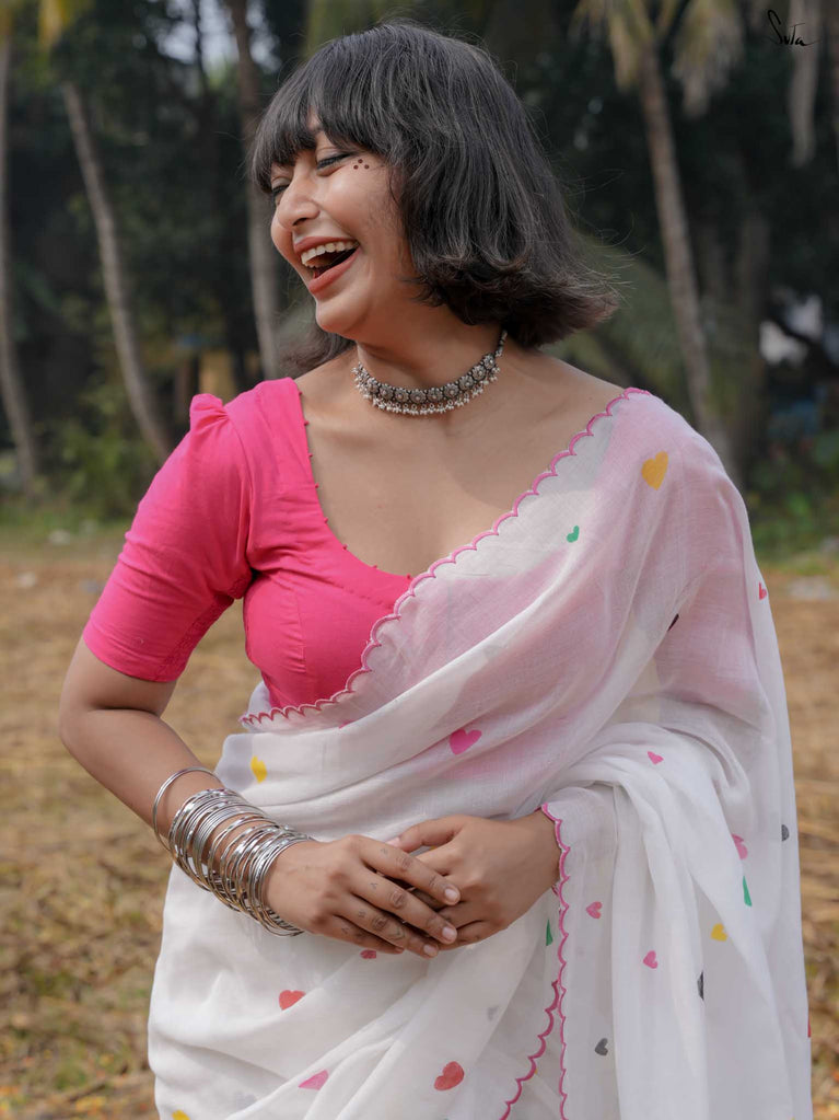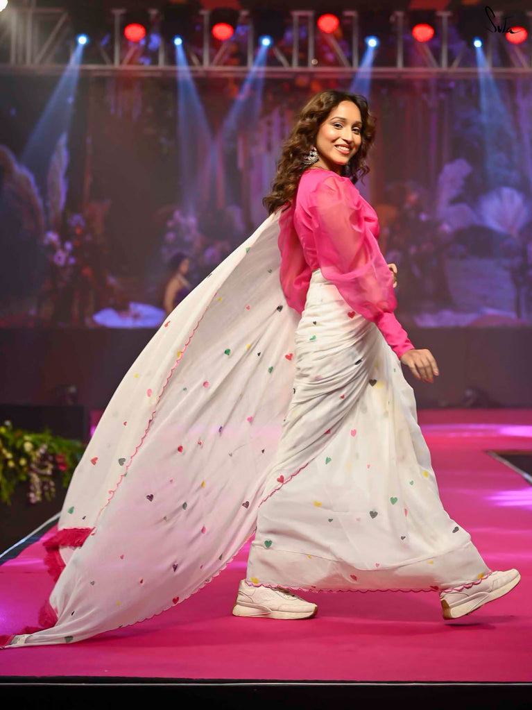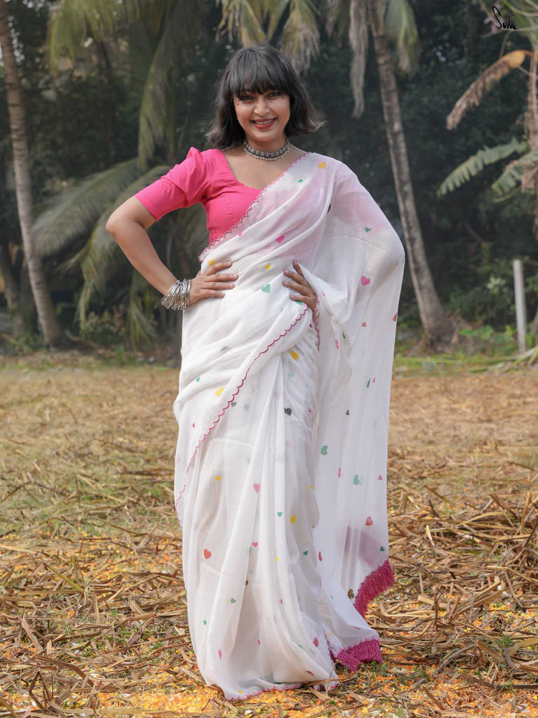 This white sareeis a love letter to Holi itself, a celebration of love stitched into every thread. Each block print & hand-embroidered multicolor heart tells a tale of connection, of moments shared, of memories created on a festival filled with colors. The playful jhalar tassels, with their twinkling charm, add a flutter of excitement, while the scalloped edges bring a soft, romantic feel. It’s the perfect saree for those who wear their heart in the most colorful of ways.