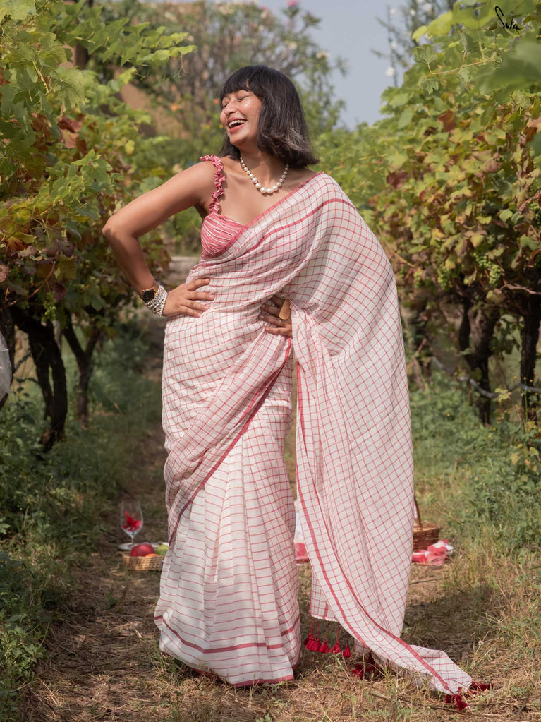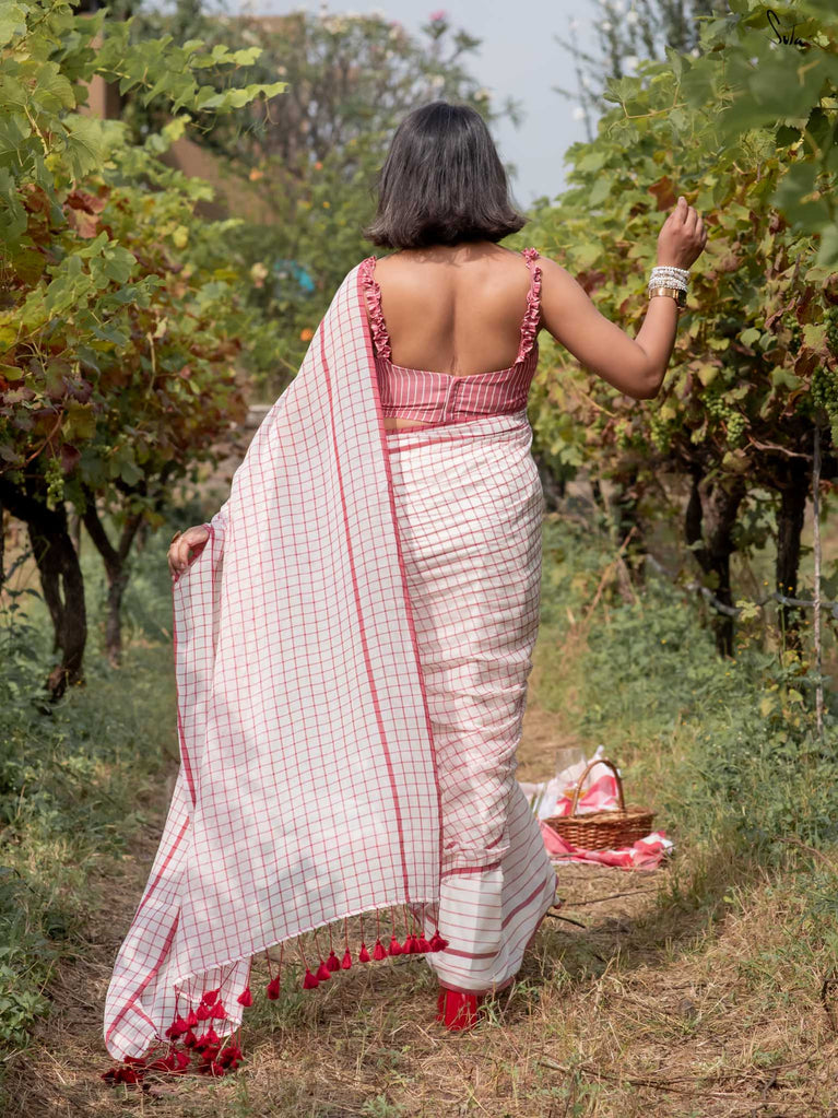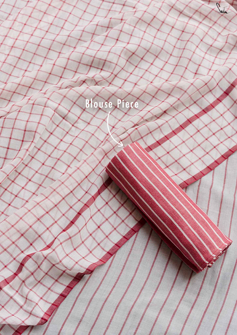 Imagine the flutter of a heartbeat that skips a beat, the rhythm quickening with every thought of love. Dil on Grid captures this very essence in its weave. Crafted from soft mul cotton, the saree features delicate off-white, maroon checks and stripes, coming together in a harmonious visual melody. Playful maroon tassels dance gracefully along the pallu, bringing a hint of charm to the ensemble. This saree comes with a matching striped blouse piece attached.