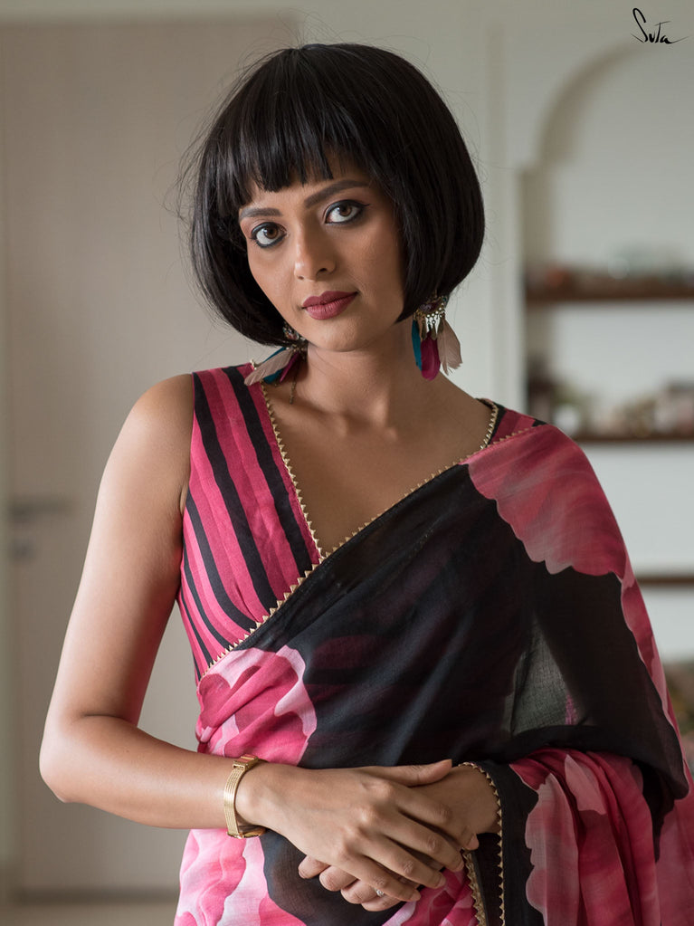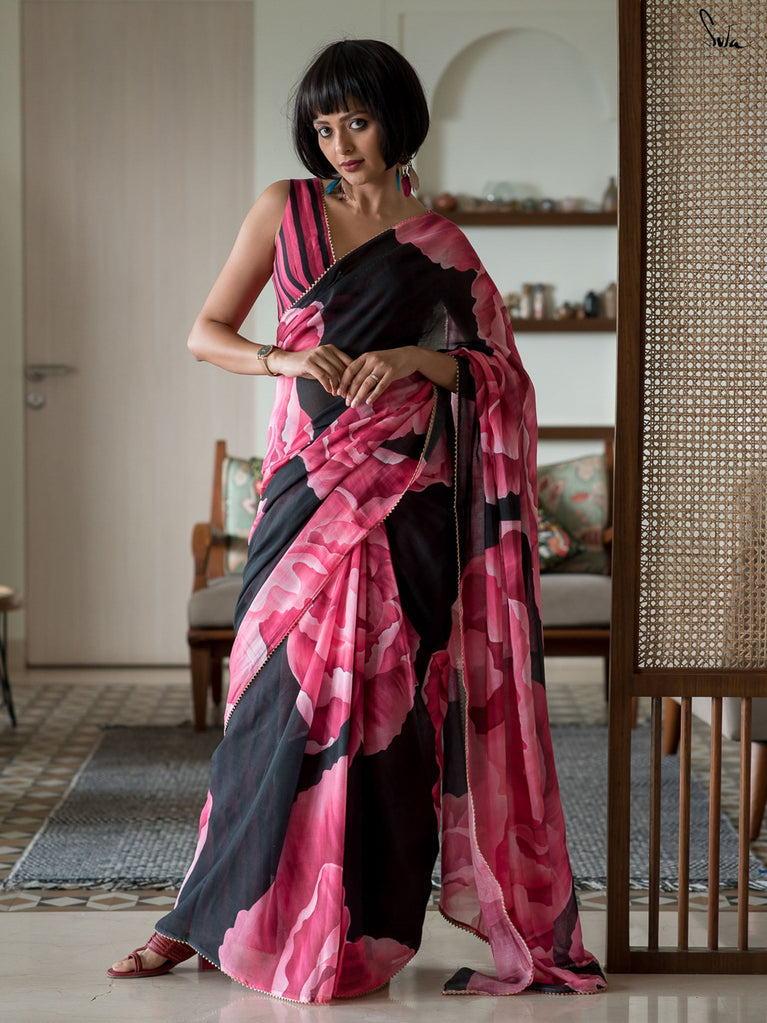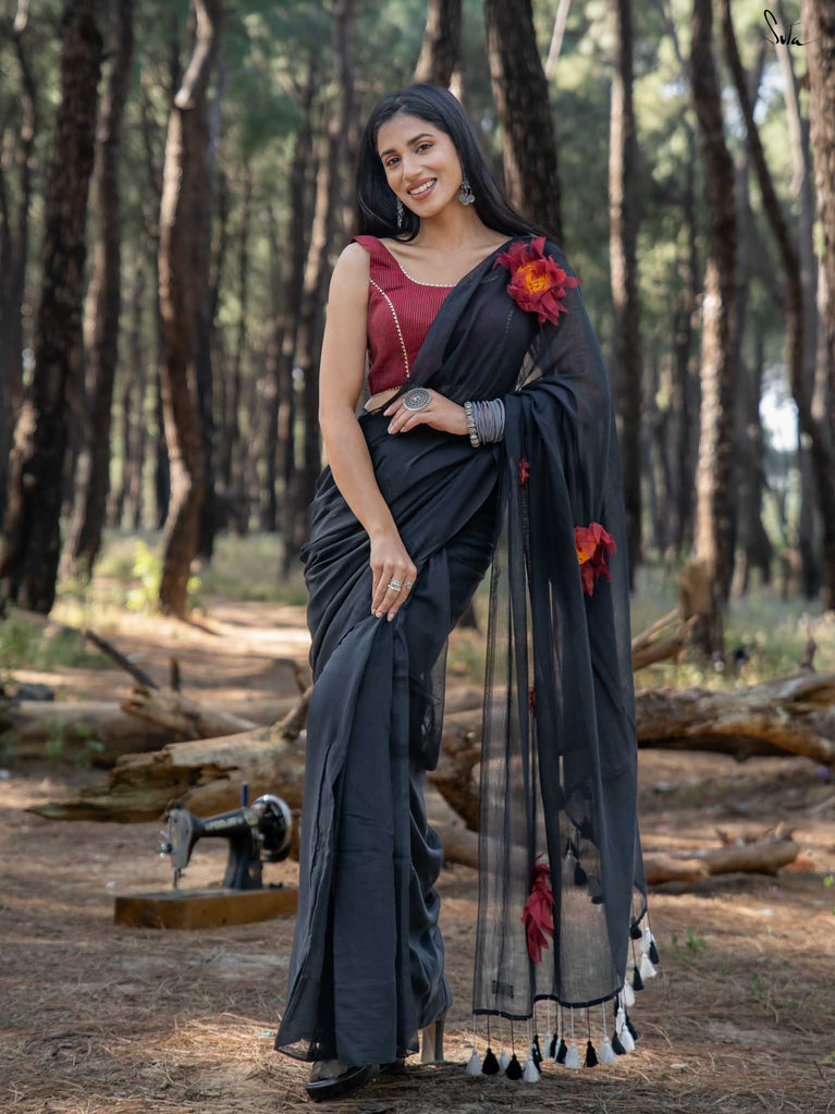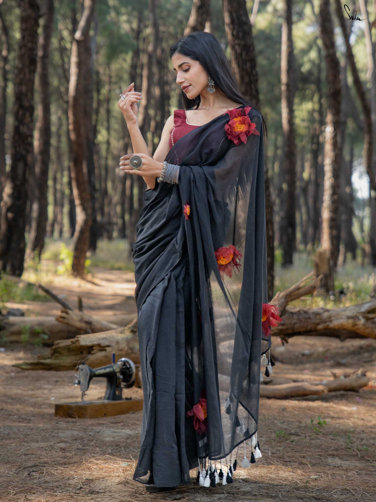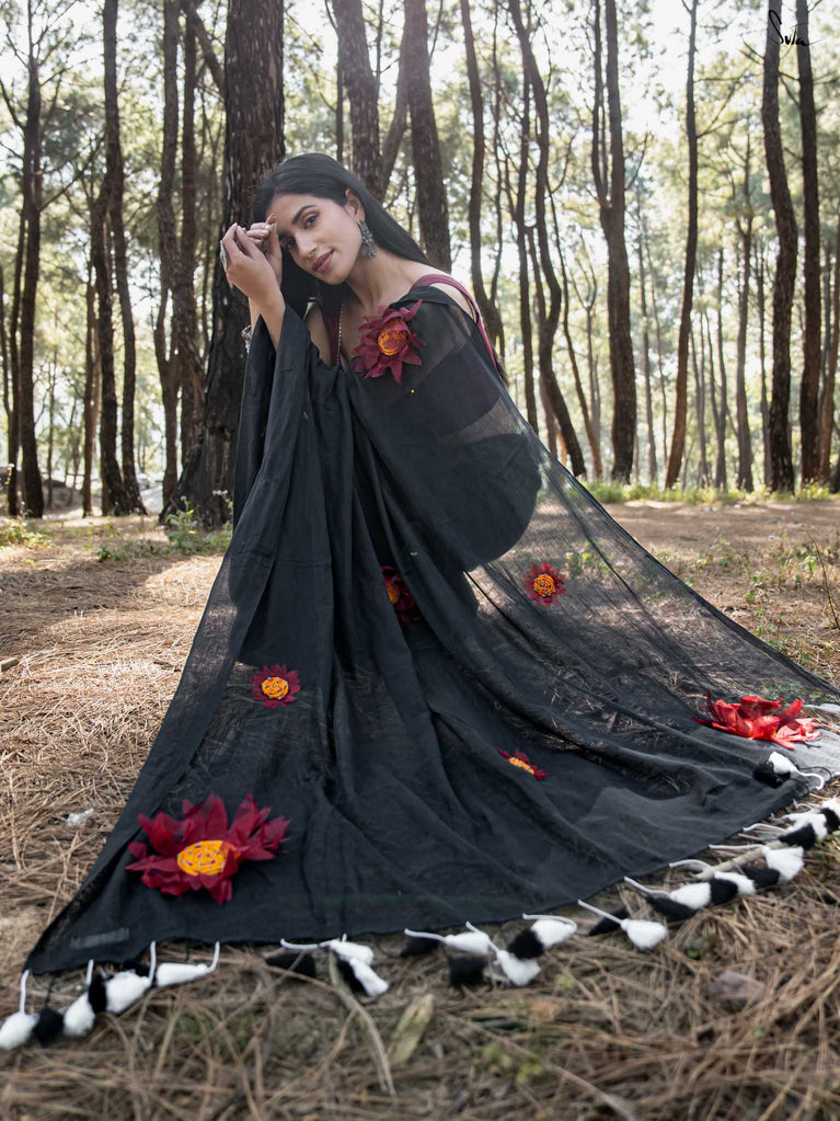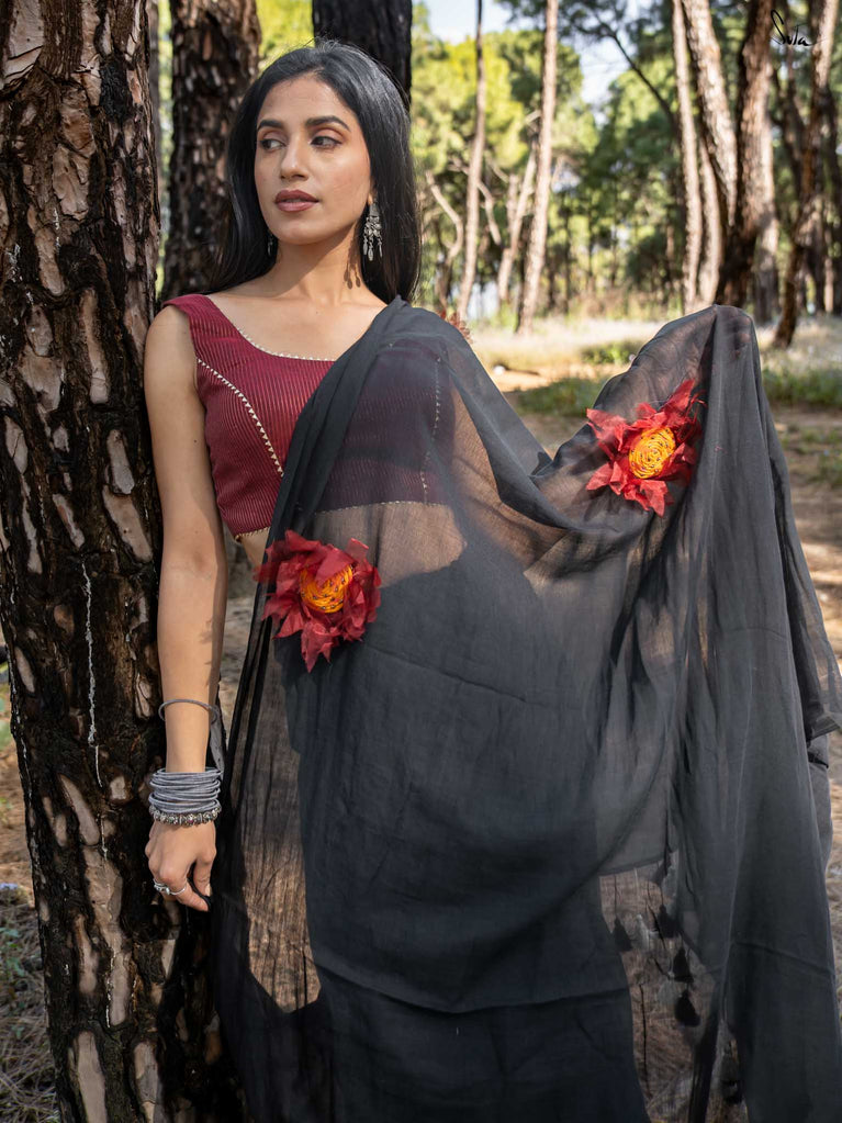This saree is timeless elegance with a blooming twist. The soft black mul cotton drapes like a dream - lightweight, breathable, and endlessly flattering, making it a perfect go-anywhere, glow-everywhere piece.