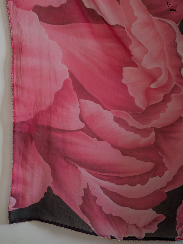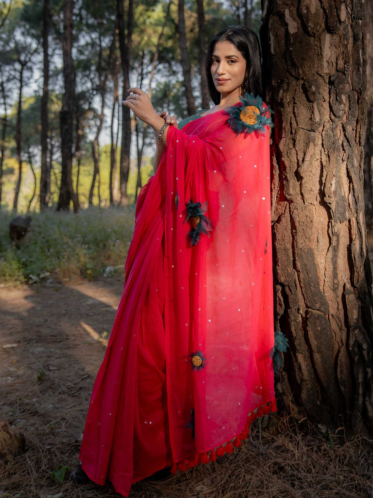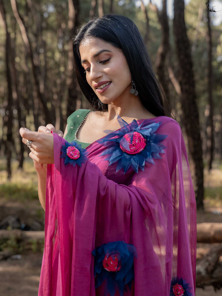A hand-stitched 3D organza sunflower blooms gently along the saree, crafted petal by petal and finished with delicate cording. The thoughtfully placed motif rises subtly from the fabric, adding texture, depth, and a spark of handcrafted charm.