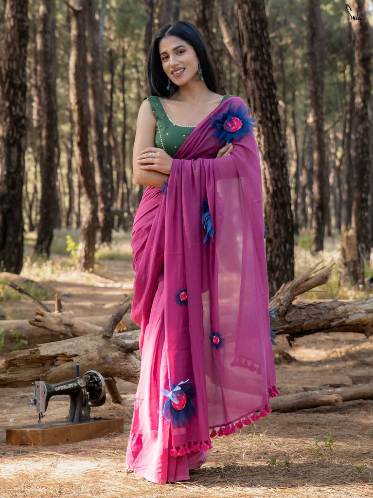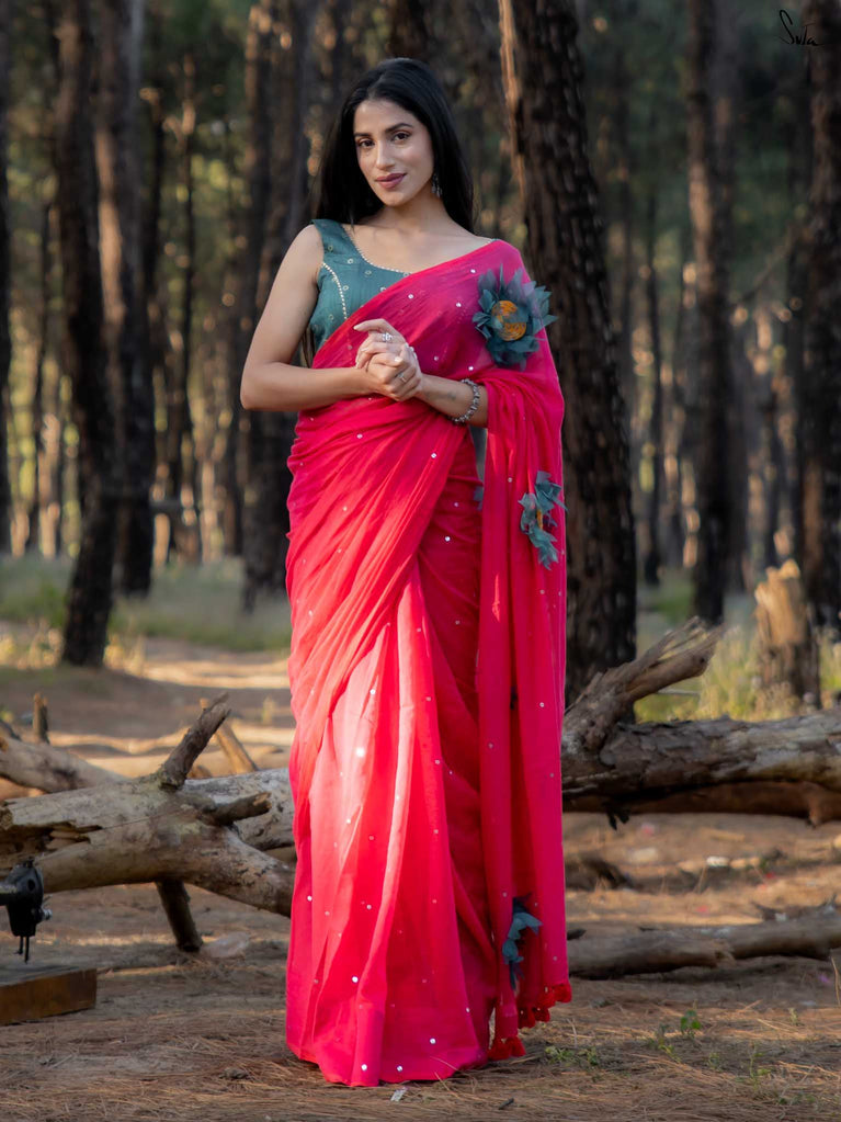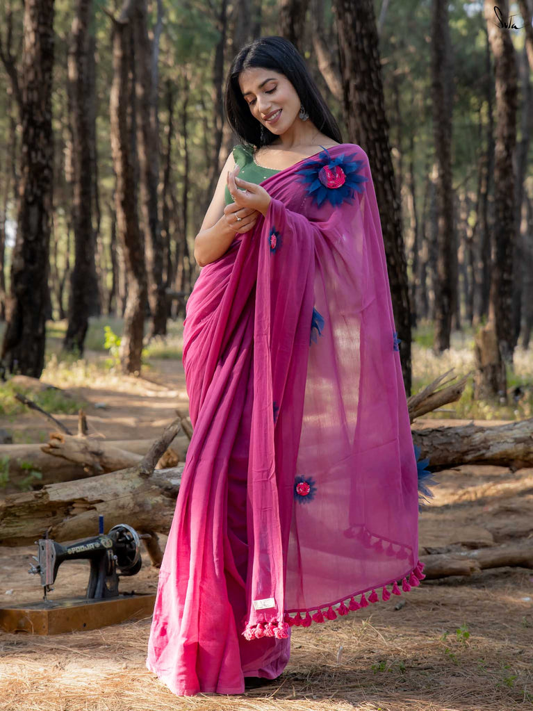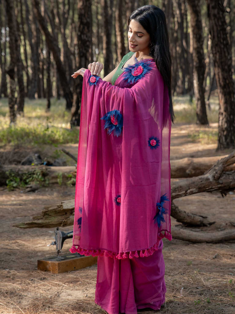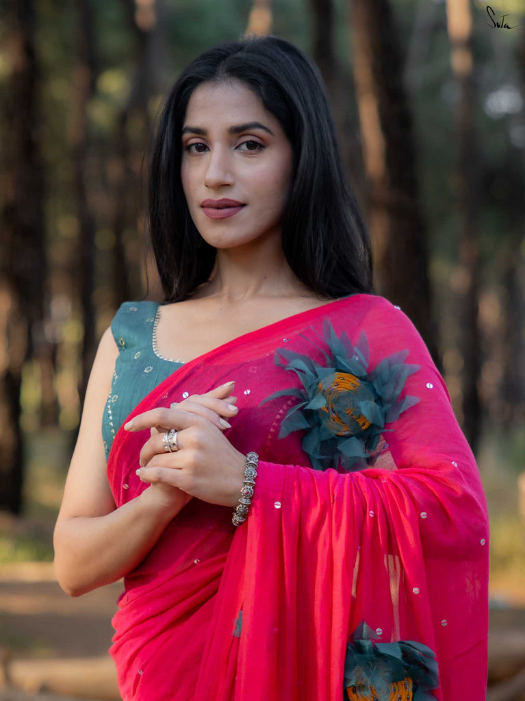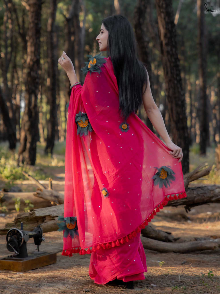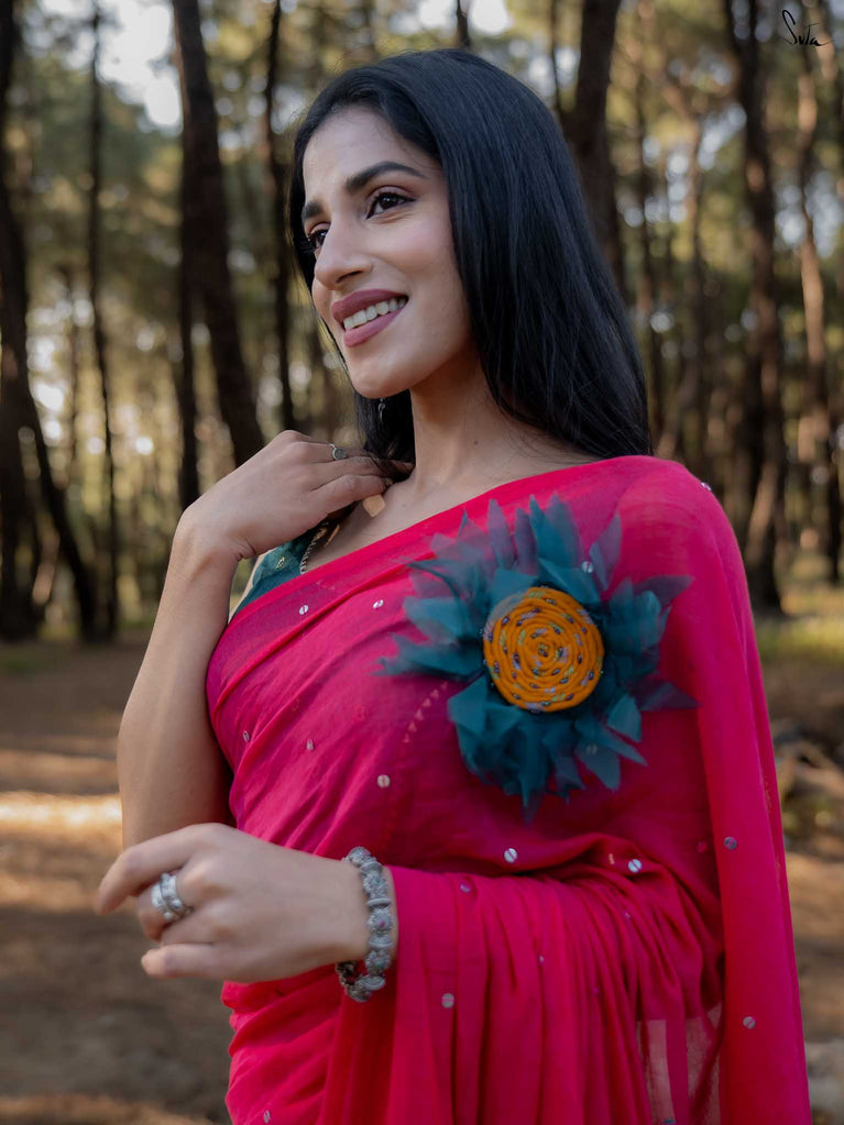 This saree is a playful splash of colour, crafted in whisper-soft mul cotton that feels like second skin. The vibrant pink hue brings instant cheer, turning every moment into a bright, blooming one.
