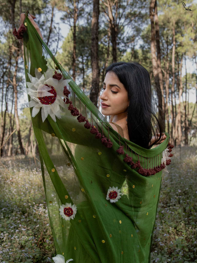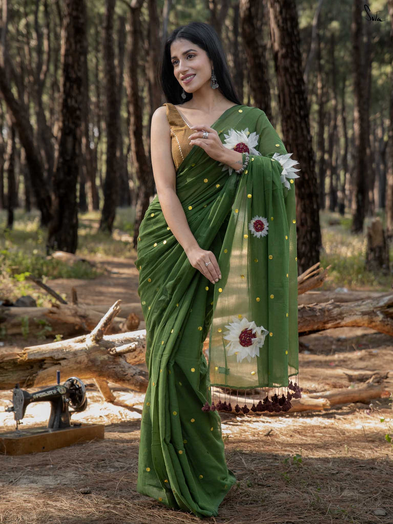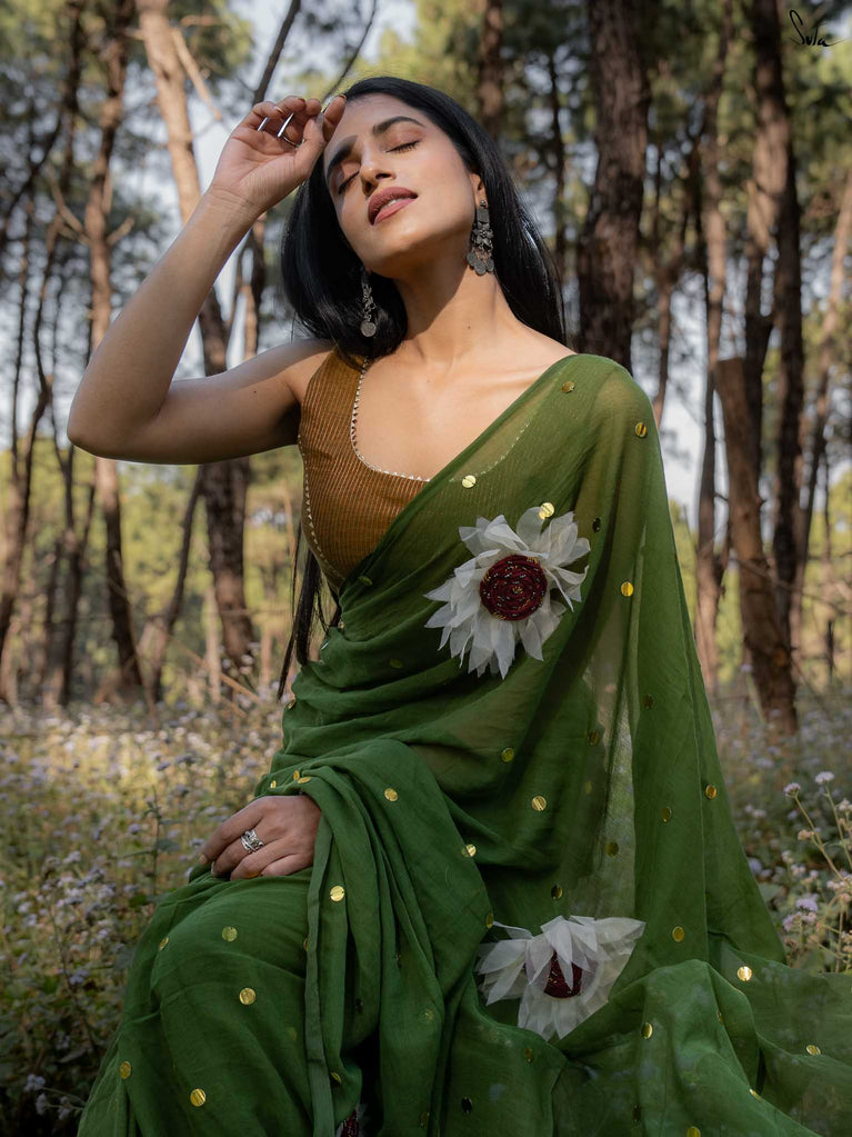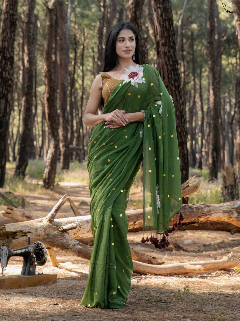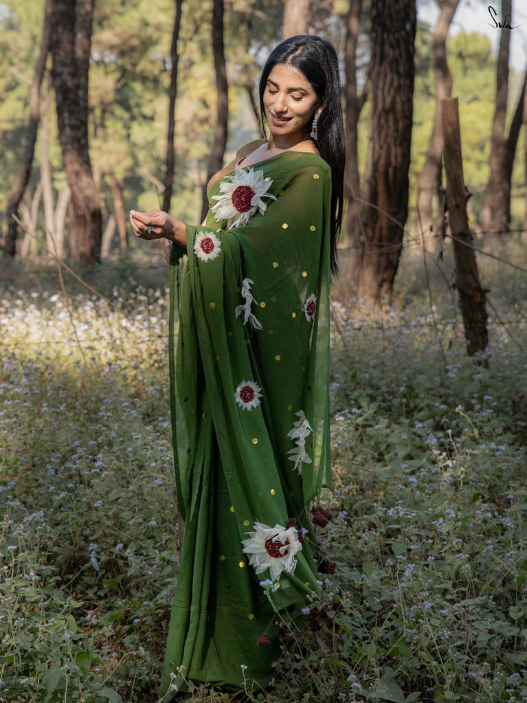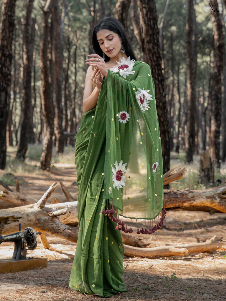 This saree brings together earthiness and bloom in the softest way. The olive mul cotton drapes like a gentle breeze - light, breathable, and naturally elegant, perfect for days when you want understated charm with a touch of artistry.