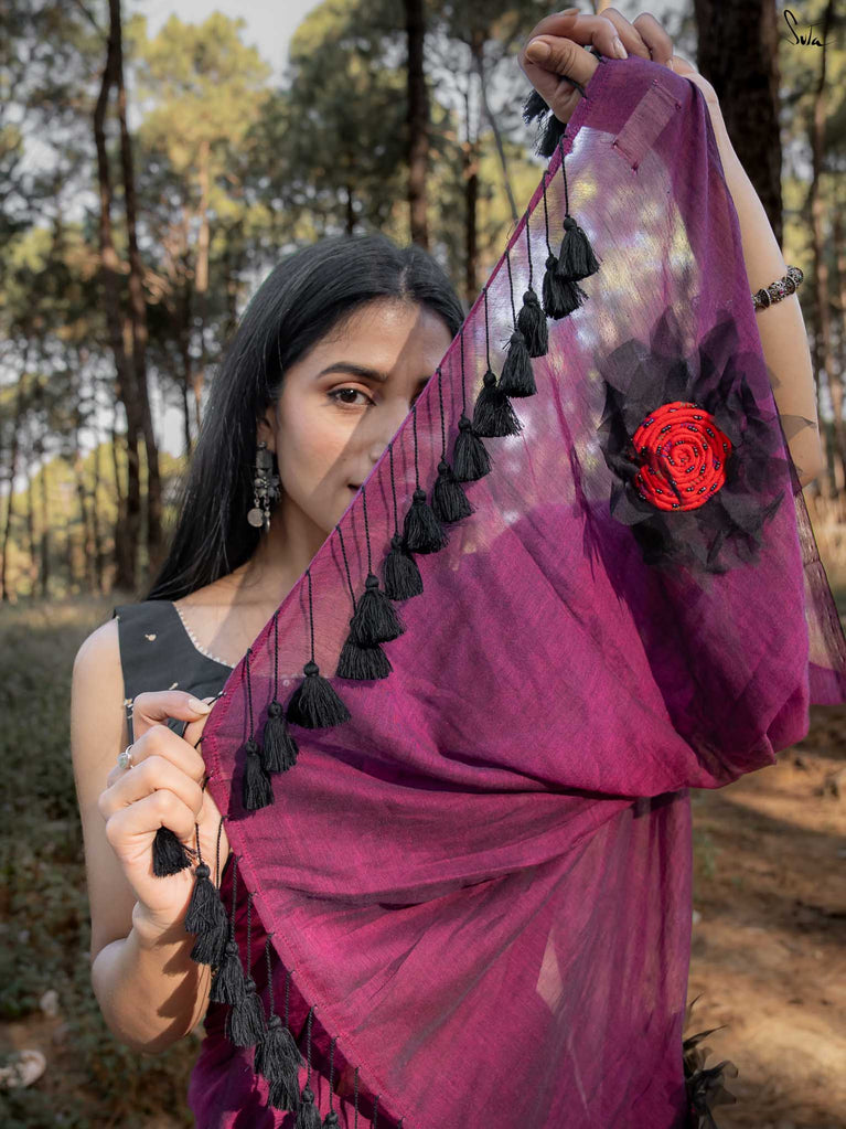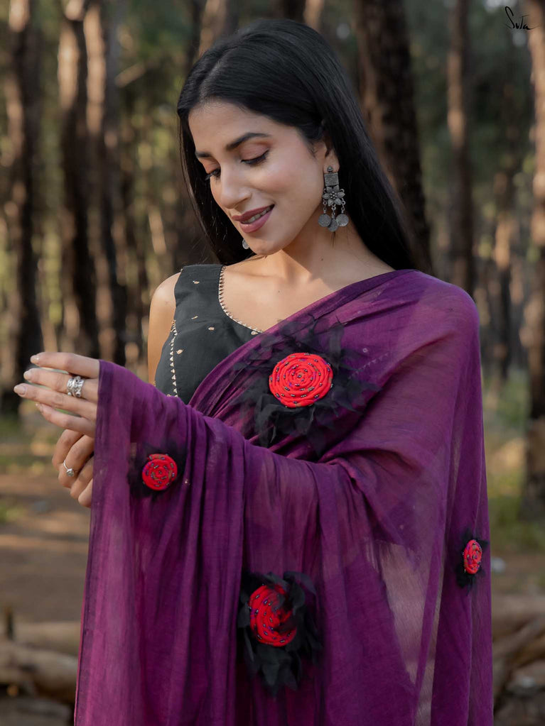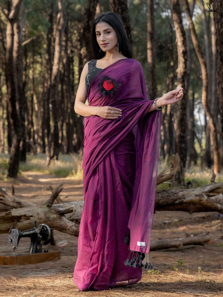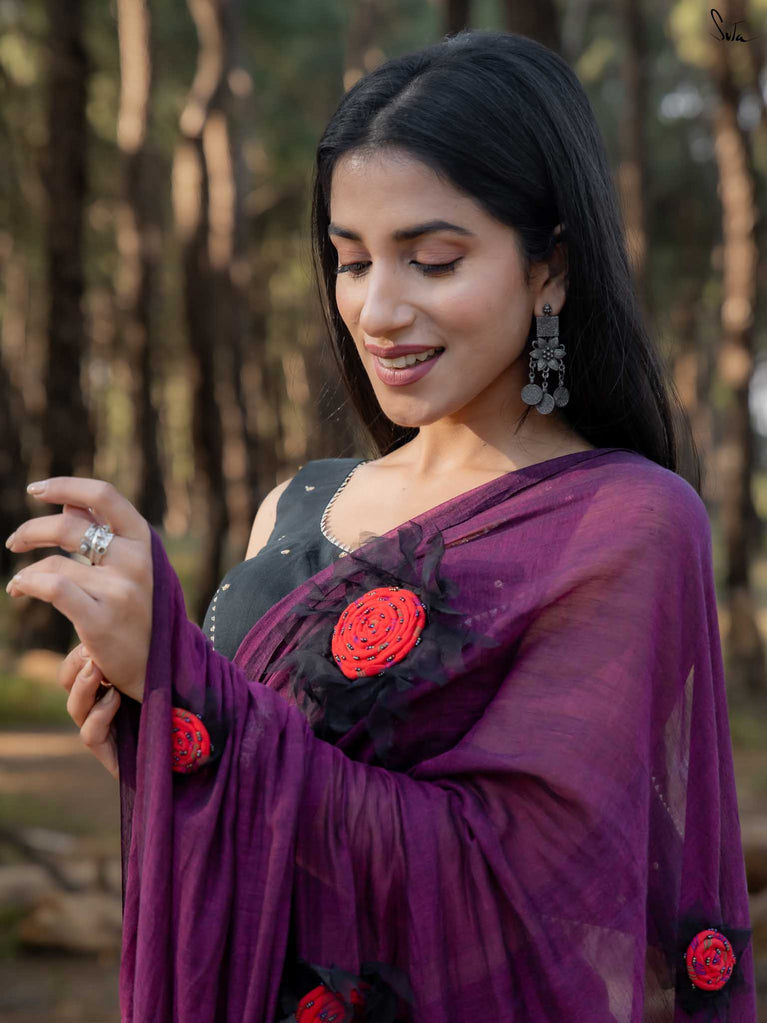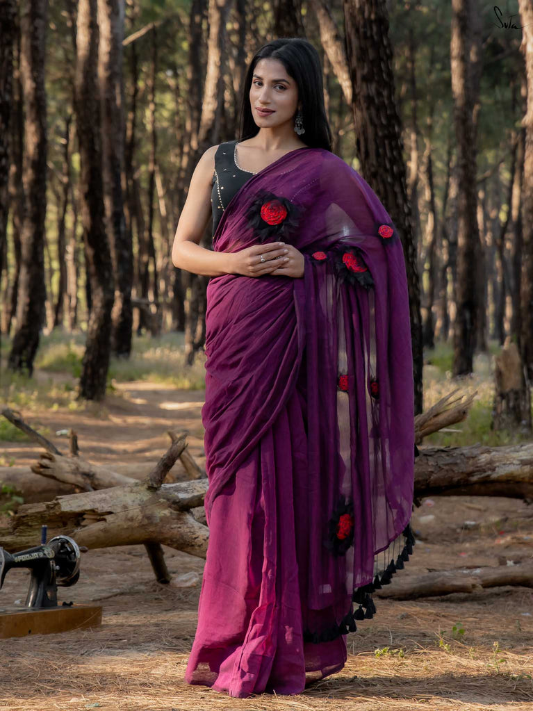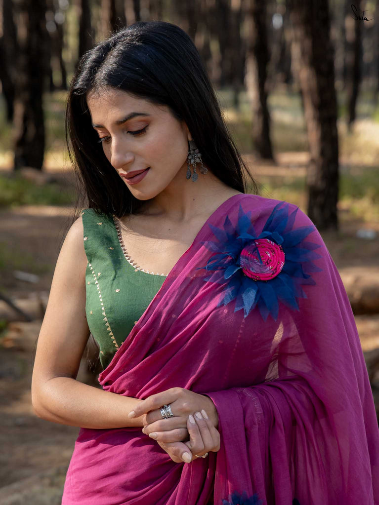 This saree is elegance steeped in deep, velvety hues. Crafted from airy mul cotton, the saree feels feather-light yet luxurious, wrapping you in comfort with every move.