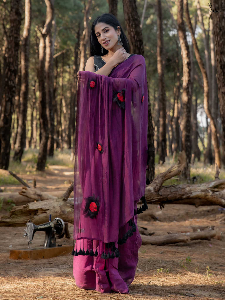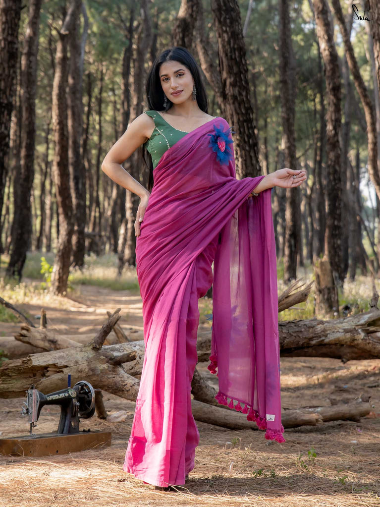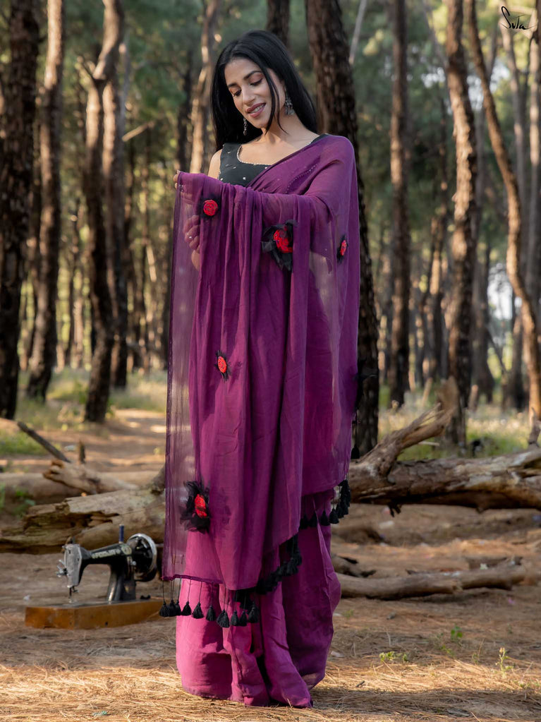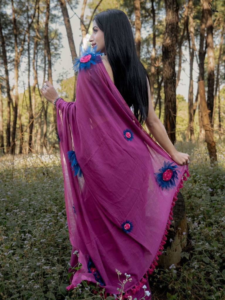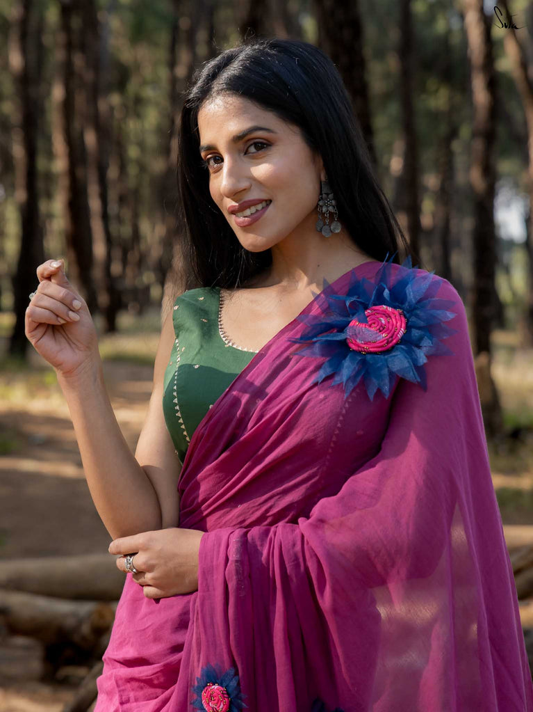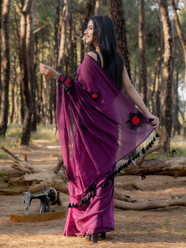 This saree is elegance steeped in deep, velvety hues. Crafted from airy mul cotton, the saree feels feather-light yet luxurious, wrapping you in comfort with every move.