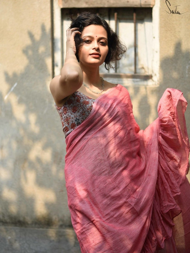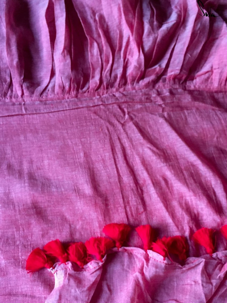 This saree is softness turned into a saree. The gentle pink mul cotton drapes like a whisper, light, airy and effortlessly comforting - perfect for long days, warm afternoons, and moments when you want to feel quietly radiant.