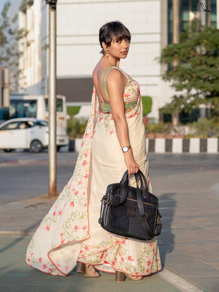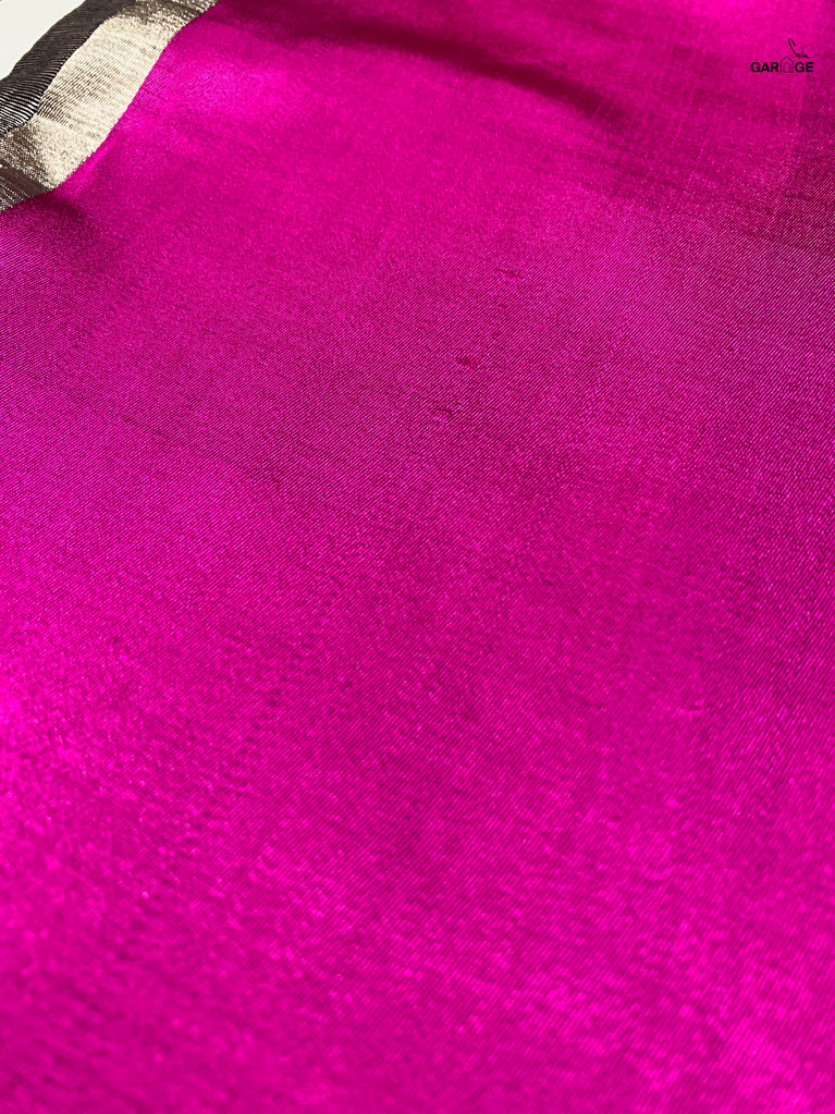 Unfold into grace with Fuchsia Fiza, a lovely off-white cotton linen saree that radiates warmth and beauty. The enchanting fuchsia border, paired with pink scalloped lace, evokes the gentle elegance of blooming flowers, making you feel as beautiful as you look. As you drape this stunning saree, its serene charm adds an aura of calm and refined elegance to your style. Pair it with the Phool blouse for a confident and effortlessly chic look that exudes sophistication.