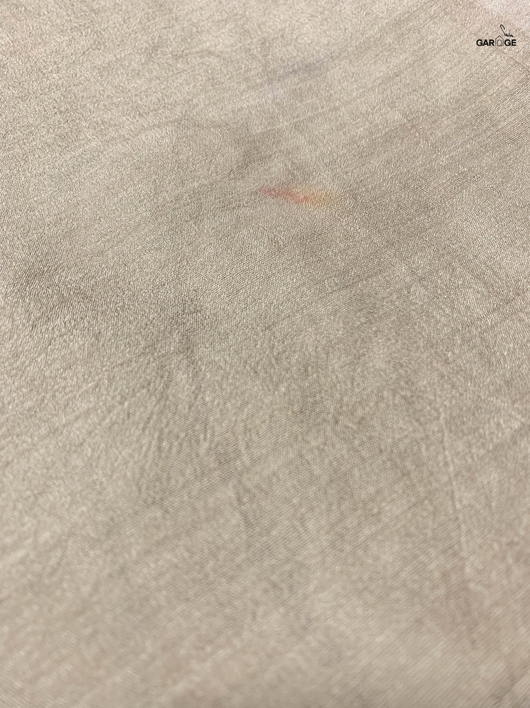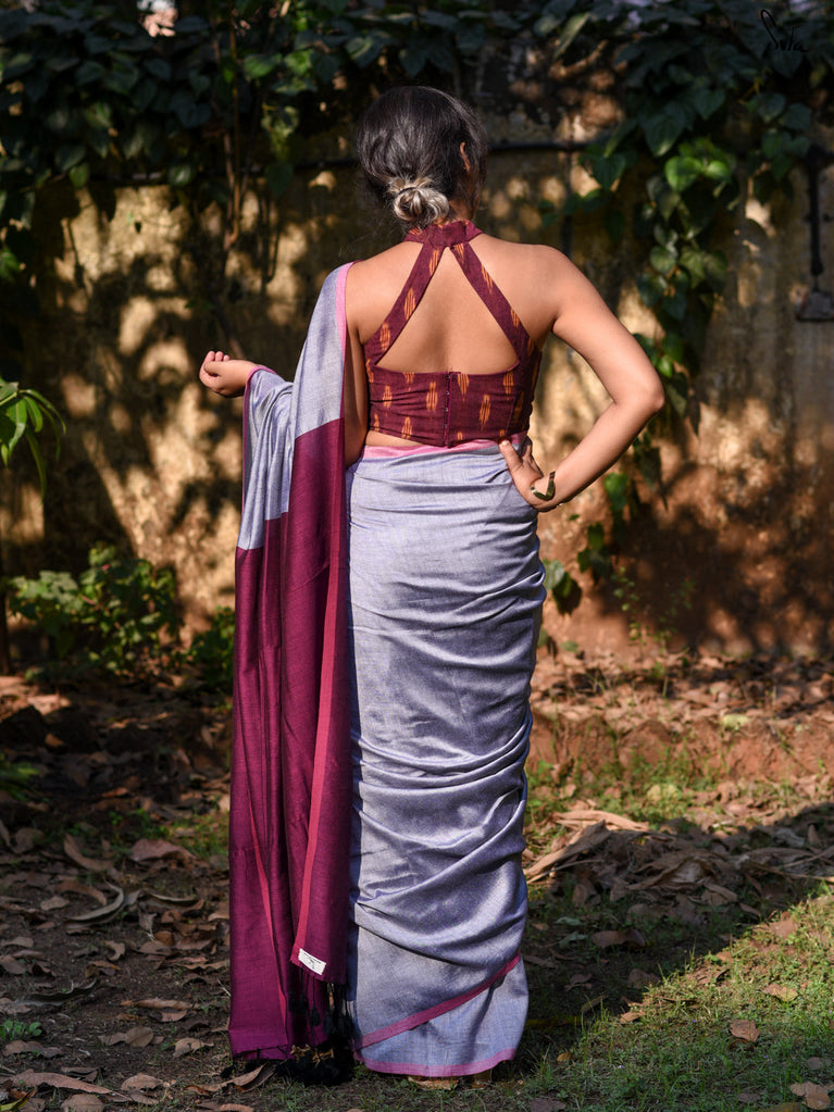 This saree has been handwoven by a master weaver in the Mashru tradition. The Mashru weave is said to have originated in West Asia, in the 19th Century. The fabric is woven with a silk weft and a fine cotton warp. It thus combines the ageless comfort of cotton and the timeless aesthetic of silk, elevated by the presence of gold and silver zari.