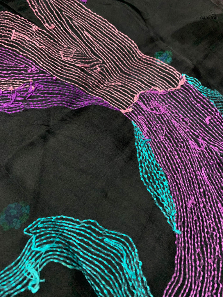 This is a handwoven Mulberry silk saree with beautiful kantha work on it.Mulberry silk is a high-quality variety of silk obtained from cocoons of silk worms that feed only on Mulberry leaves. The brilliant shine that vibrates from this silk fabric spells class and traditional beauty. With handloom silk, woven by hand, the magic is exponentially more! The silk threads on the warp and weft of the handloom are woven into a fabric by the master weavers and the magic that ensues is beautiful!Kantha is traditional embroidery that originated from the nimble hands of industrious women who upcycled fabric bits by stitching them together and crafted a beautiful kaleidoscope of art in the process. It has since evolved into a stunning craft that is practiced by artisans through generations. Kantha refers to a specific kind of stitch, the most basic one being a simple, straight, running stitch. The artisans use spectacular motifs based on simple geometric grids or more complicated, naturalistic designs including birds, foliage, animals and scenes of everyday activities. Working on a design using kantha stitch completely is a fully hand-done, laborious process and thus each saree can take 40-50 days to complete. As kantha work comes to life on fabrics, it transforms into a legacy that is often passed forward as heirloom.