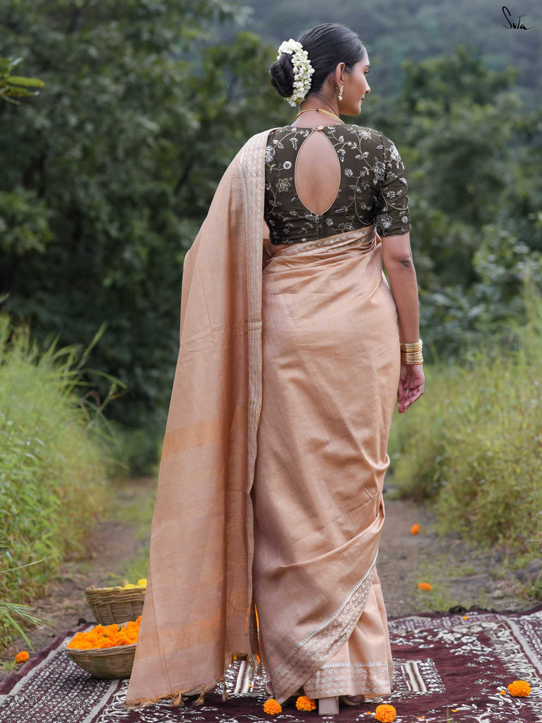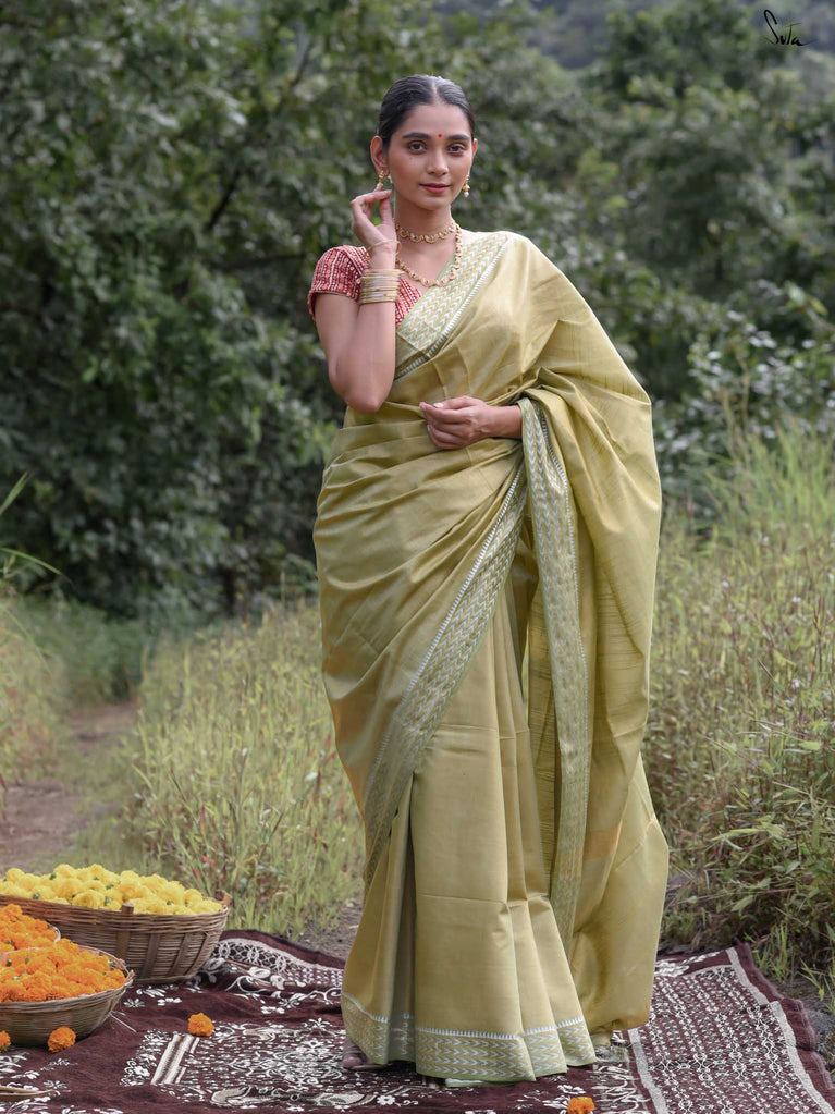 An olive green saree that feels grounded and graceful. The colour carries a sense of calm confidence and earthy charm. The geometric dobby border adds definition and style, keeping the look elegant and festive. Perfect for celebrations that call for subtle sophistication. Comes with a matching blouse piece, no fall.