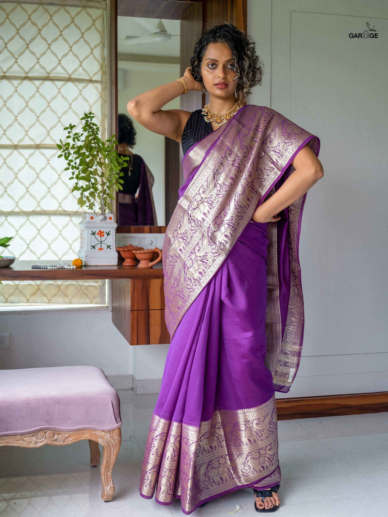 Like the melody it’s named after, Thumri flows with quiet grace and deep emotion. Draped in a rich wine hue, this cotton-silk saree carries an intricate floral jaal woven in soft, dull gold - a gentle nod to timeless opulence. Light as a whisper yet regal in presence, it’s perfect for moments that call for understated celebration.
