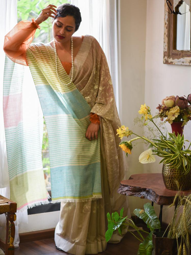 Saree : Su, the model is wearing a saree called Margaret and a blouse called Pumpkin Flounce.