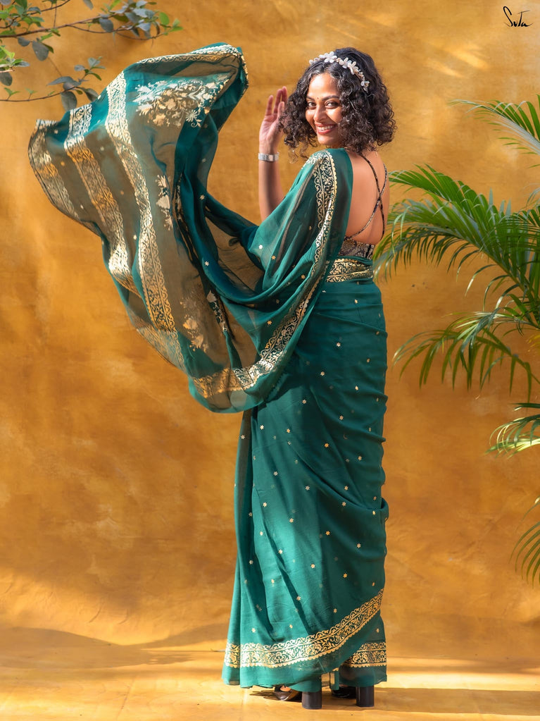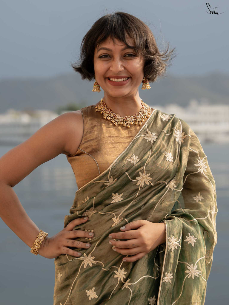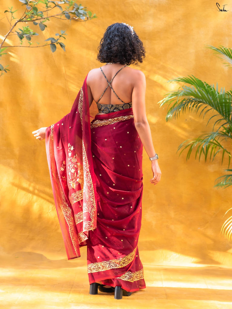 Like the silver glow of the moonlight, Arnika captures the essence of a starlit night. This rust tissue silk saree is hand-embellished with an all-over chumki work and a scalloped hand-embroidered gota patti border. Its subtle sparkle highlights your inner radiance, making Arnika perfect for moments when you want to shine with quiet elegance.