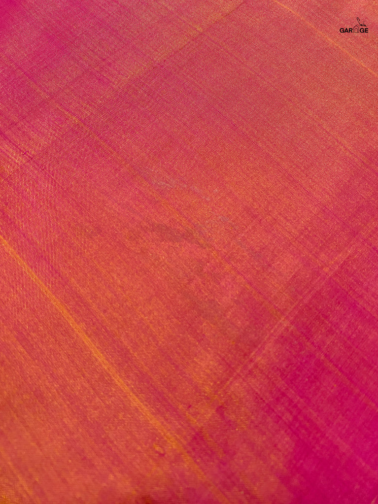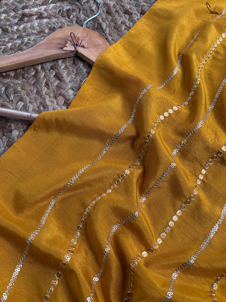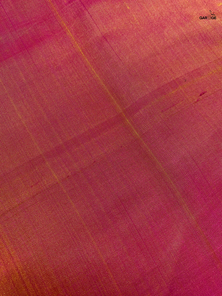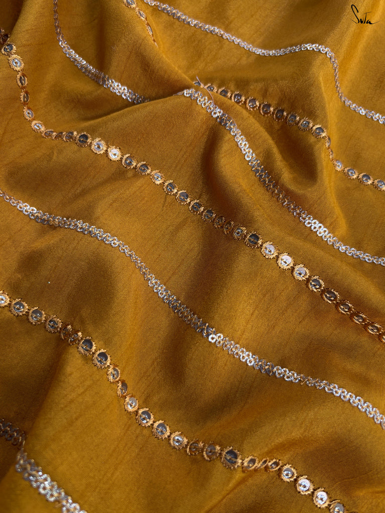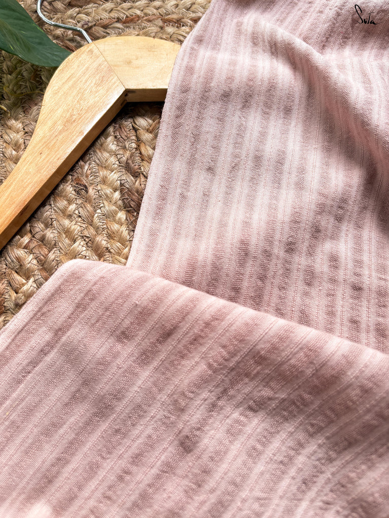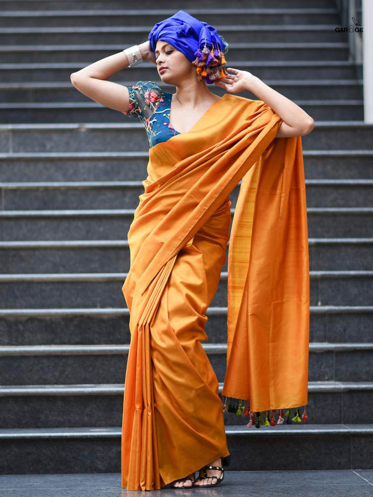 Soft never looked this stunning. This mauve crushed viscose saree carries a hush of romance with a streak of fire. The contrast tassels and gota border add to this personality.