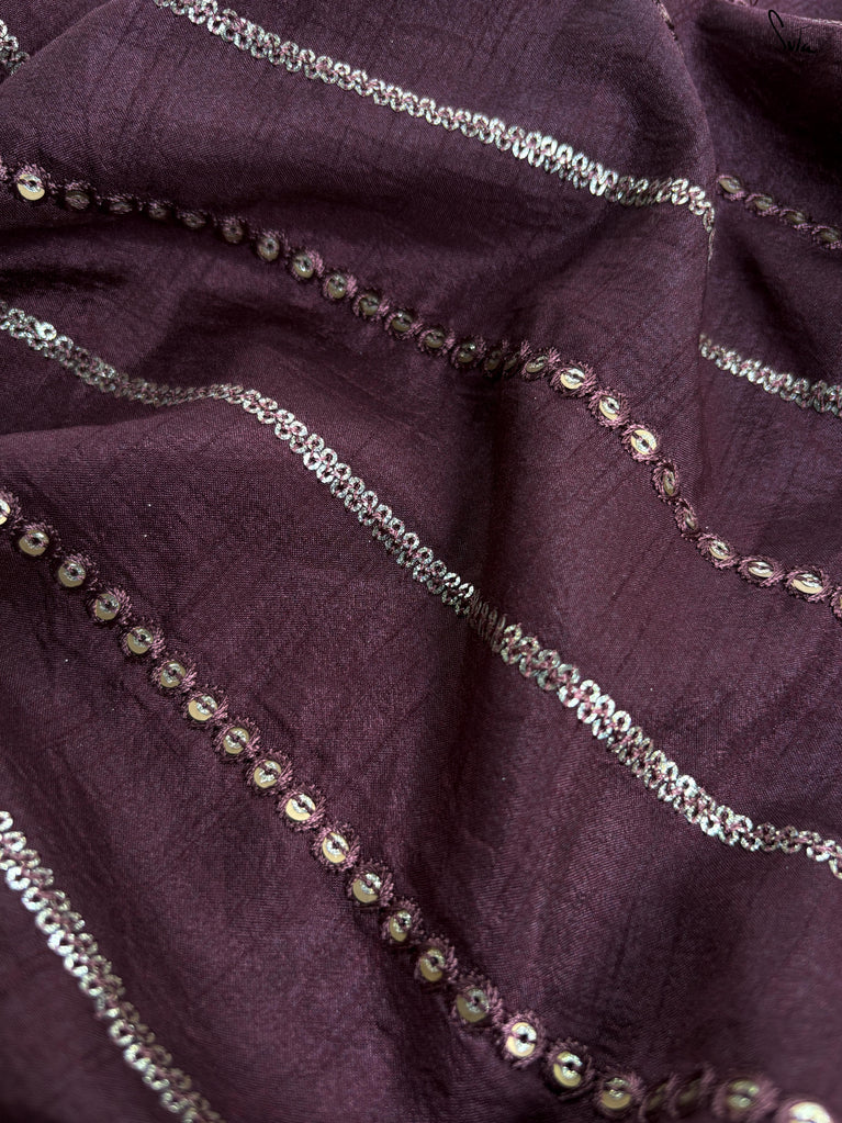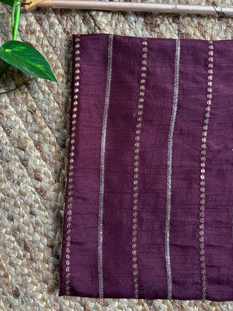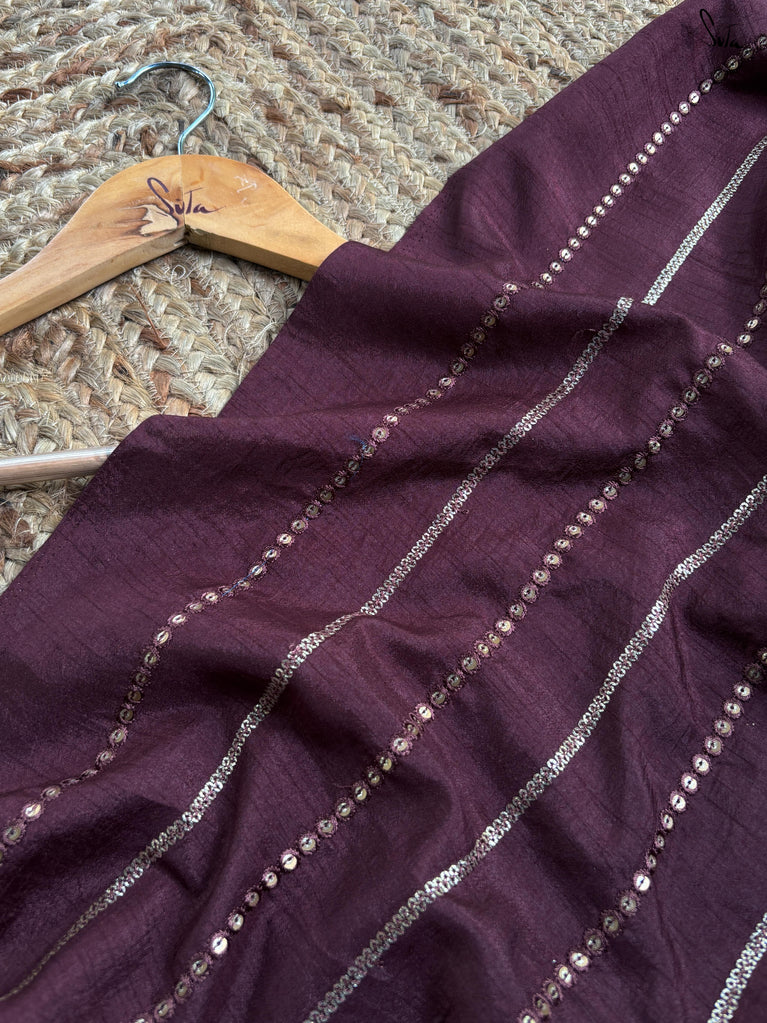 A glass of bold poured into the fabric. This wine crushed viscose saree is rich, moody, and unapologetically dramatic. Contrast tassels and a streak of gota at the border add that intoxicating flash of glam.