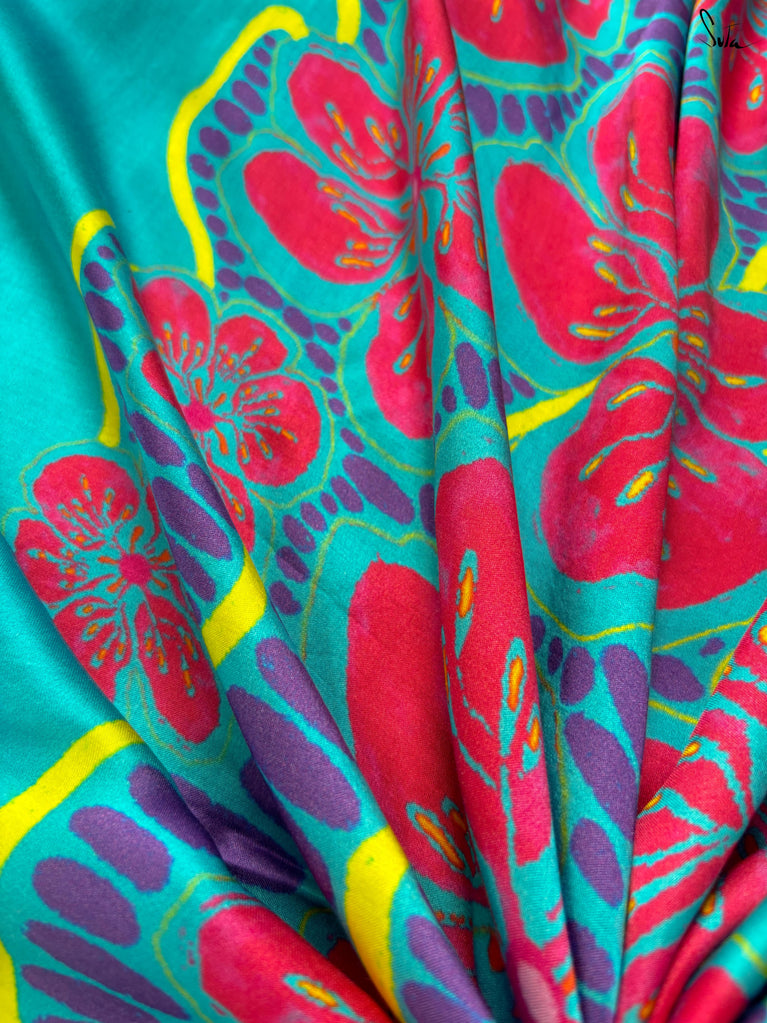Step into festive celebrations with Aalta Twist, a half-sleeve blouse in rich maroon foil organza. Featuring a V-neckline and delicate golden floral foil prints with intricate lace detailing, it’s perfect for bridesmaids, weddings, or Diwali festivities.