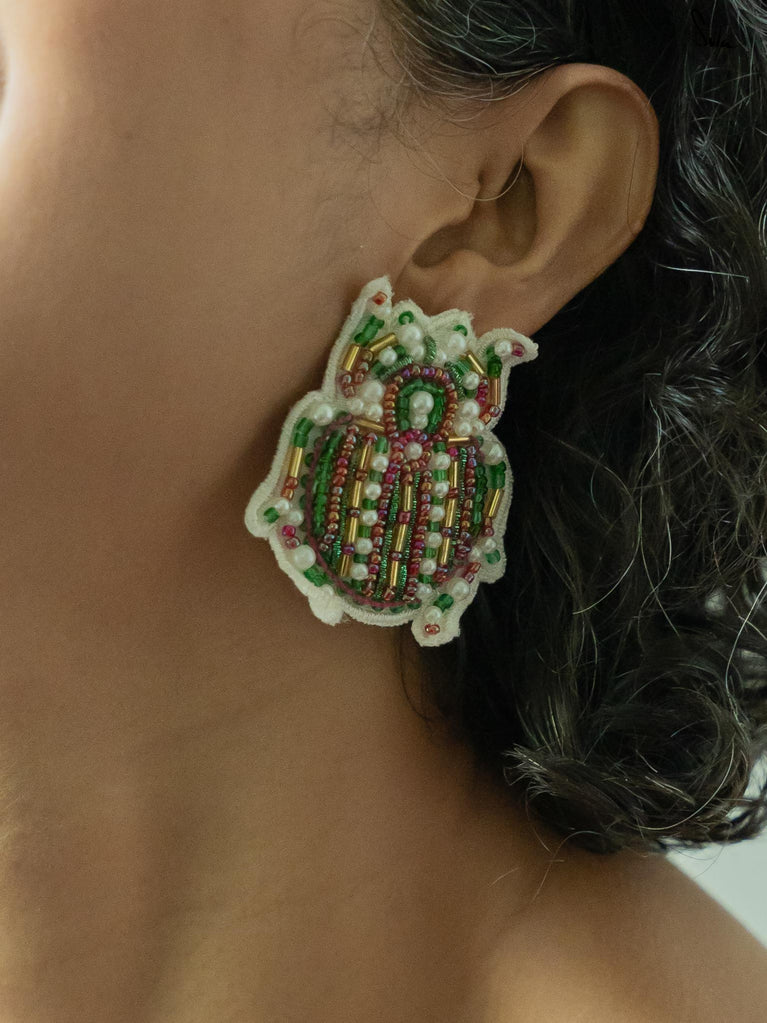 Immerse yourself in the beauty of the stunning Flambeau earring, an insect-shaped, funky piece of art. These handcrafted earrings come in an ensemble of white, red, and pink colors, and feature hand-embroidered work all over, making it a statement piece to own, wear, and slay!