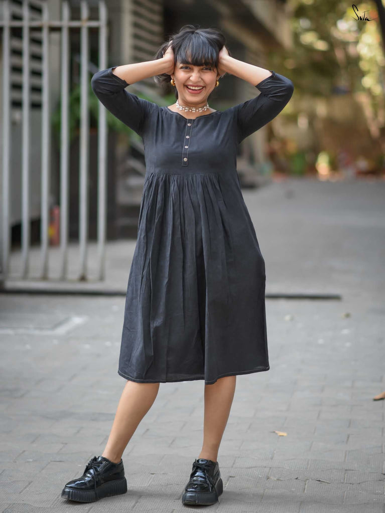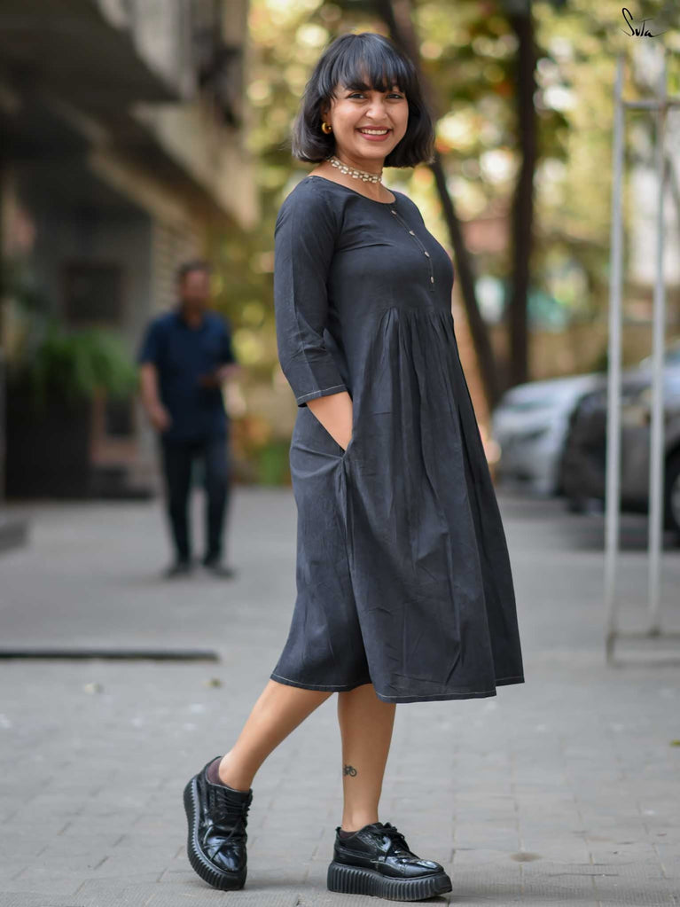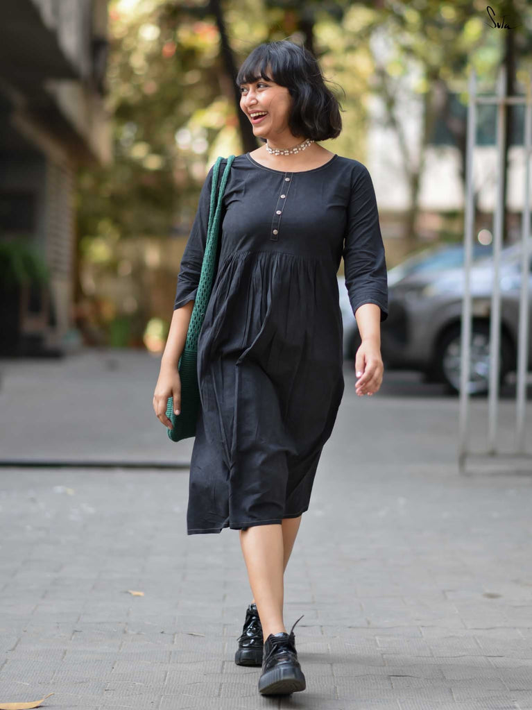 Slip into comfortable elegance and make every day a breeze with Electrical Eclipse. The sleek black dress is curated from soft, breathable cotton and features a stylish U-neckline. Elbow length sleeves and two sleek side pockets infuses the ensemble with added ease, making it perfect for a night out in the town. Take on the world with a lot of swagger, wrapped in the warm, soothing hug of Electric Eclipse.
