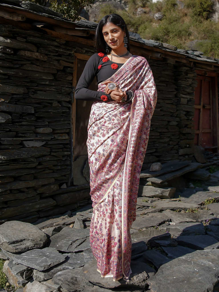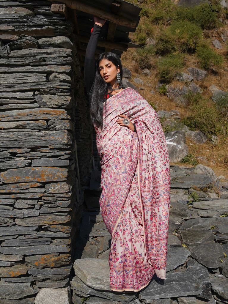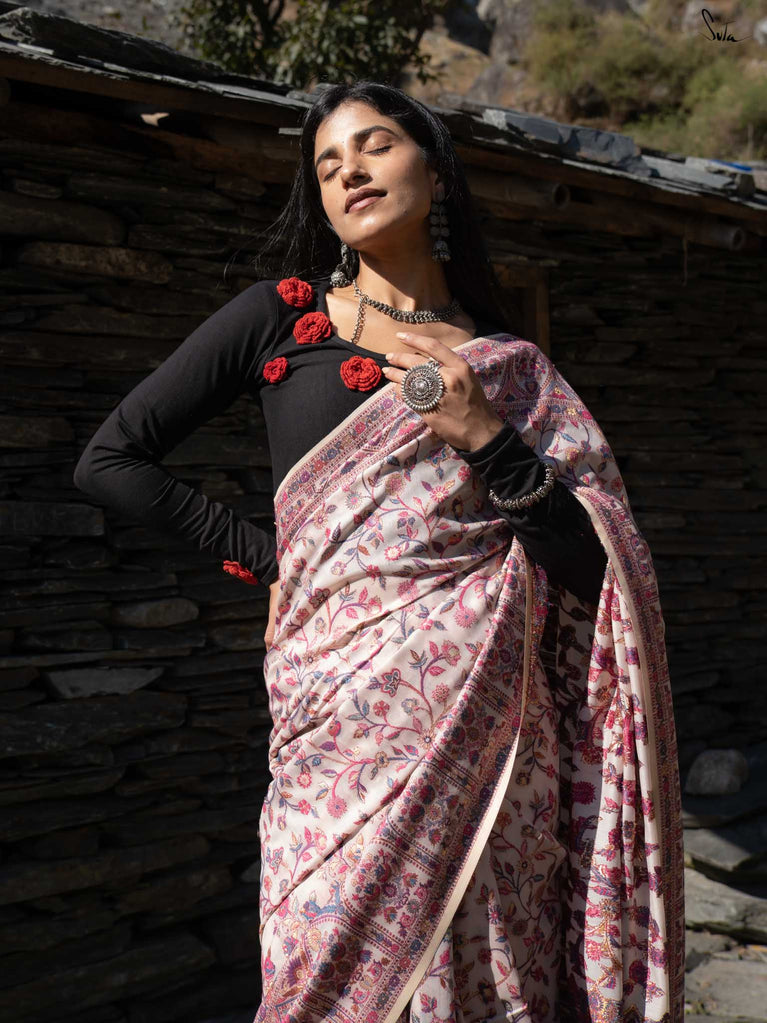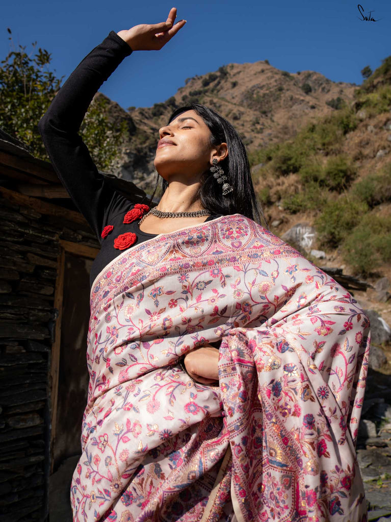 Chinar Pashm feels like autumn in Kashmir -soft, warm, and full of quiet beauty. Made from luxurious pashmina silk, this off-white saree is woven with bright, intricate patterns inspired by Chinar leaves in sunlight.Light yet rich, it blends heritage with modern elegance. Perfect for evenings when you want to look graceful without trying too hard -timeless, soulful, and simply stunning.