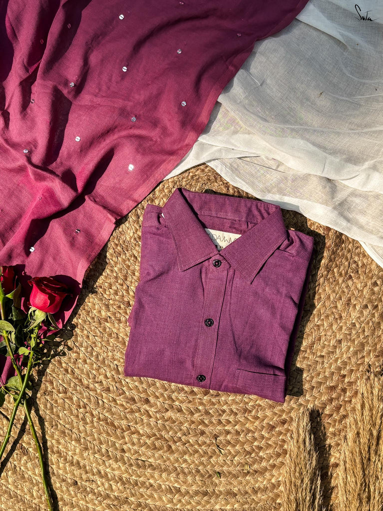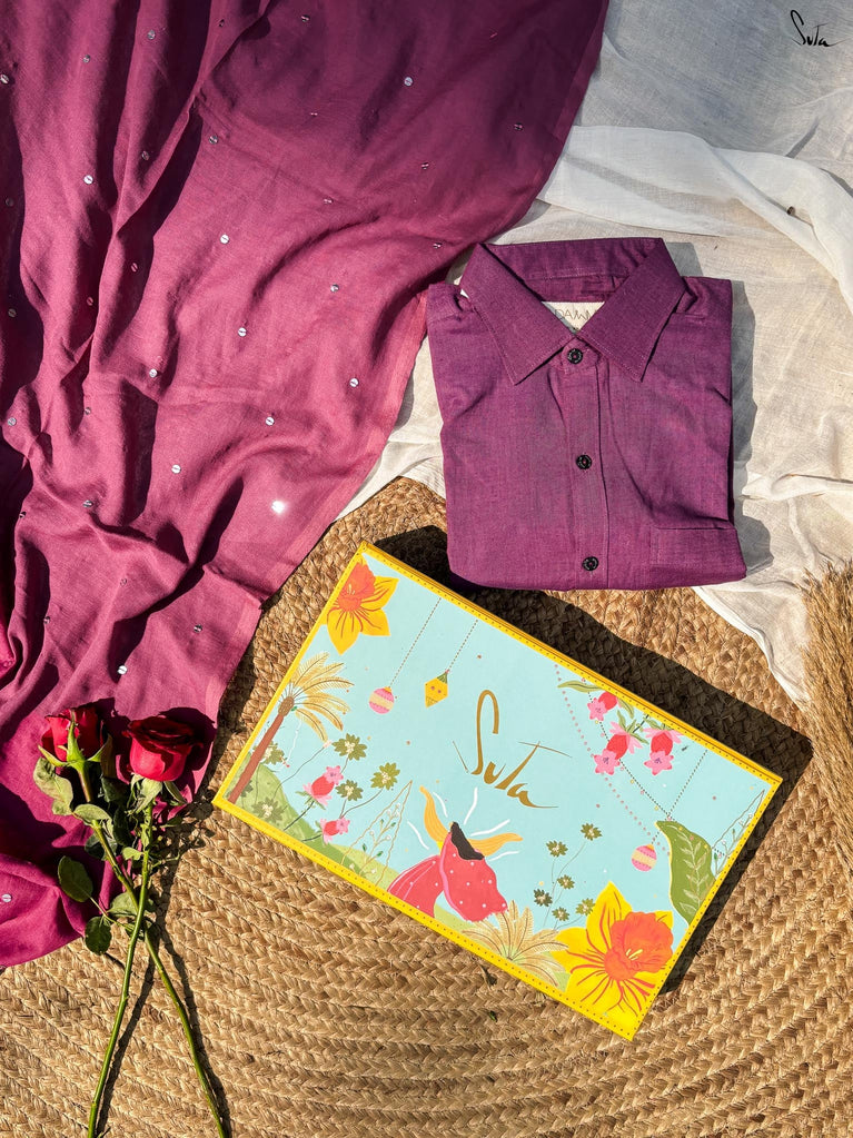 Slow love. Strong love. The kind you savour.Angoori Mitti brings together Gehra Neel, deep and dramatic like midnight thoughts, with Wine Not, a shirt - rich, bold, and a little irresistible.This one lingers - intense, intoxicating, and best enjoyed without rushing.