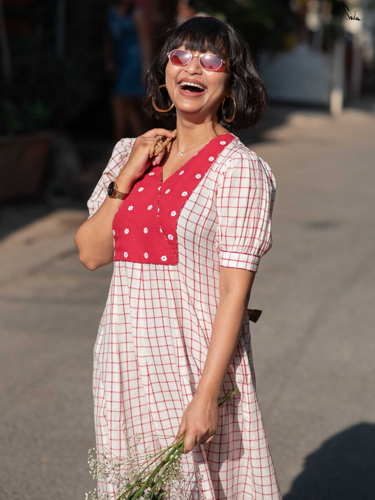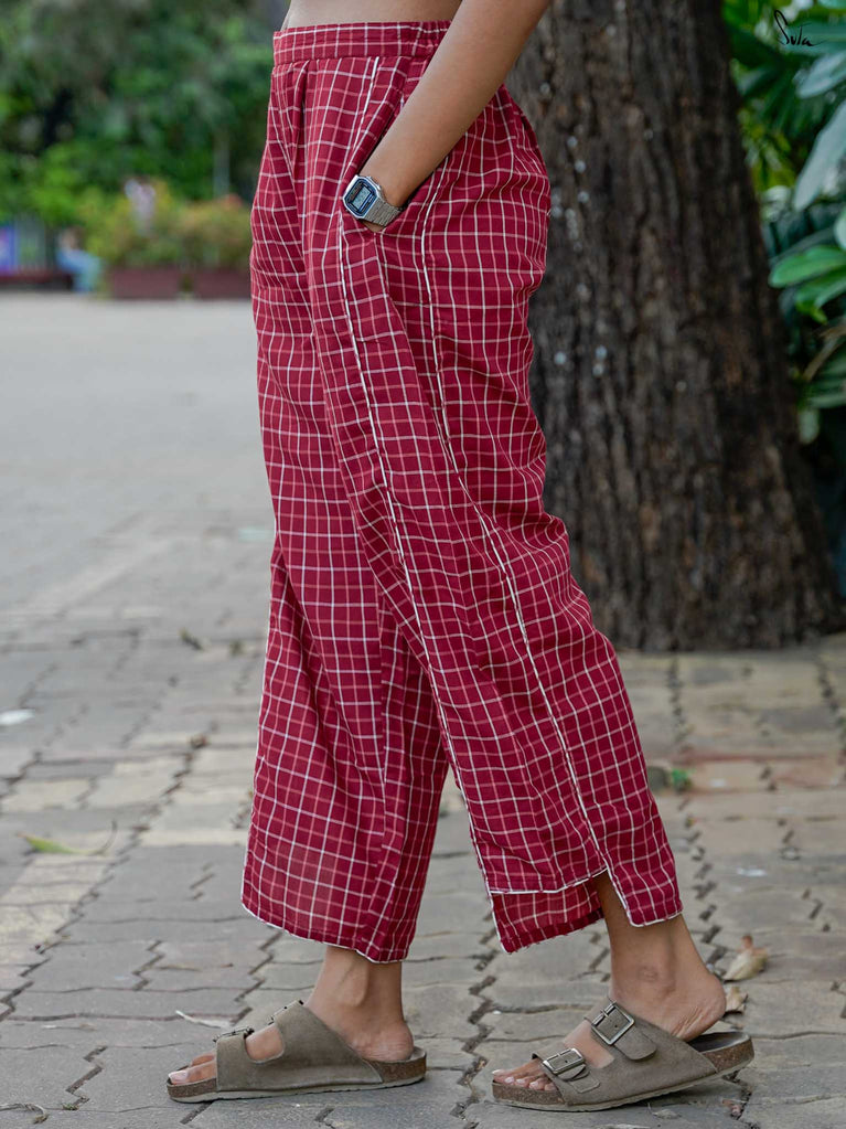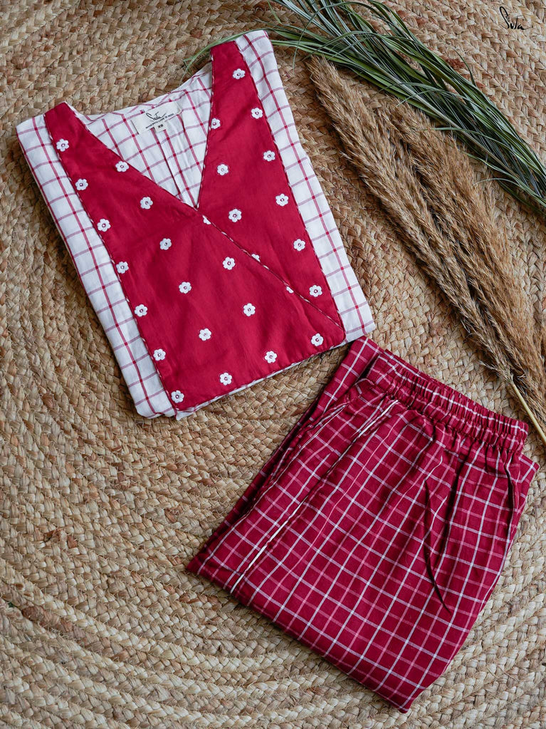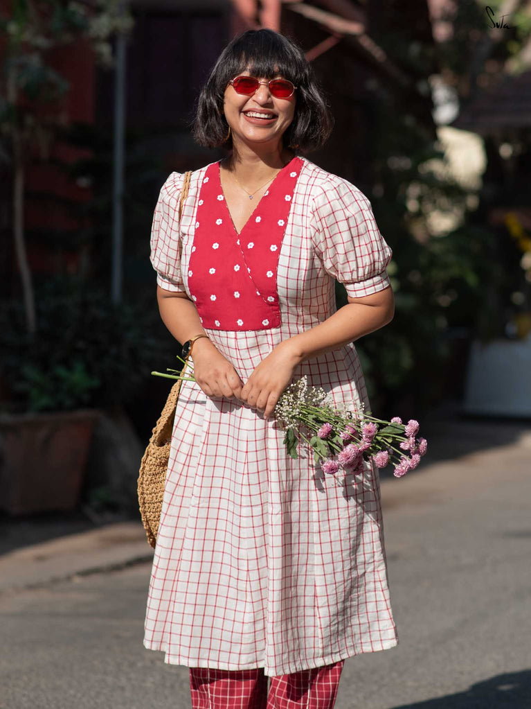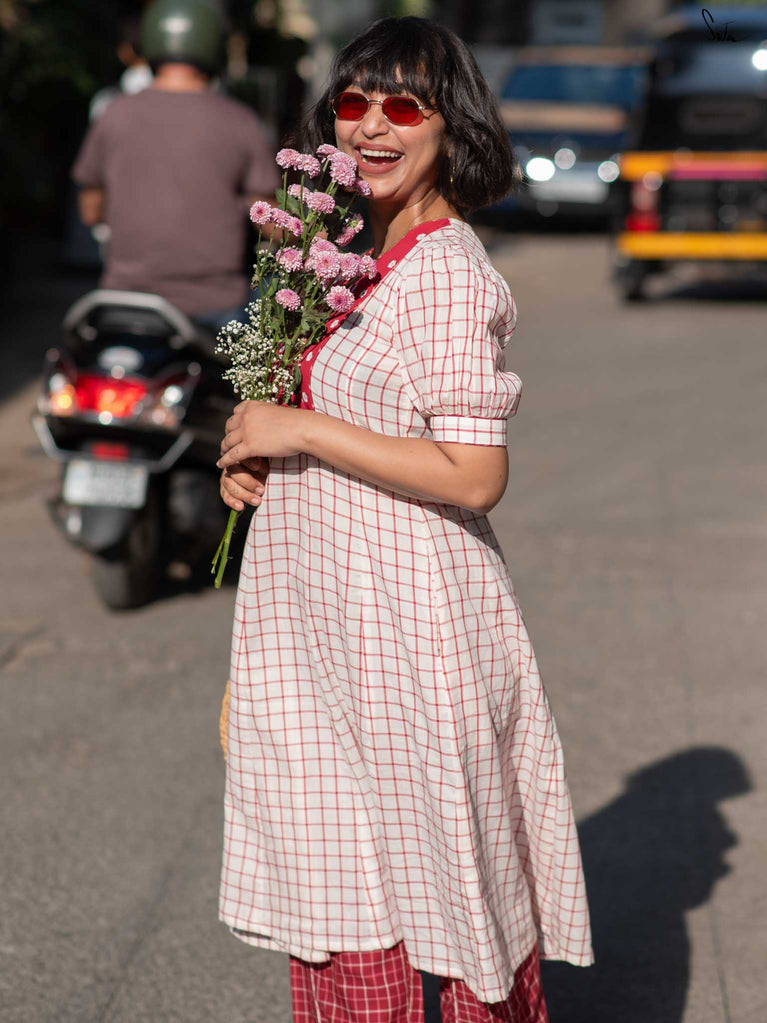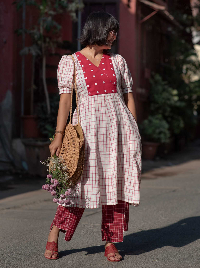 A gentle contrast, soft and striking all at once. This white checkered kurta set floats like a daydream, with a maroon yoke embroidered in florals adding quiet depth. Puff sleeves and a V-neckline bring structure, while contrast piping adds a refined touch. The matching pants offer a slit at the hem and contrast piping, allowing ease with every step.