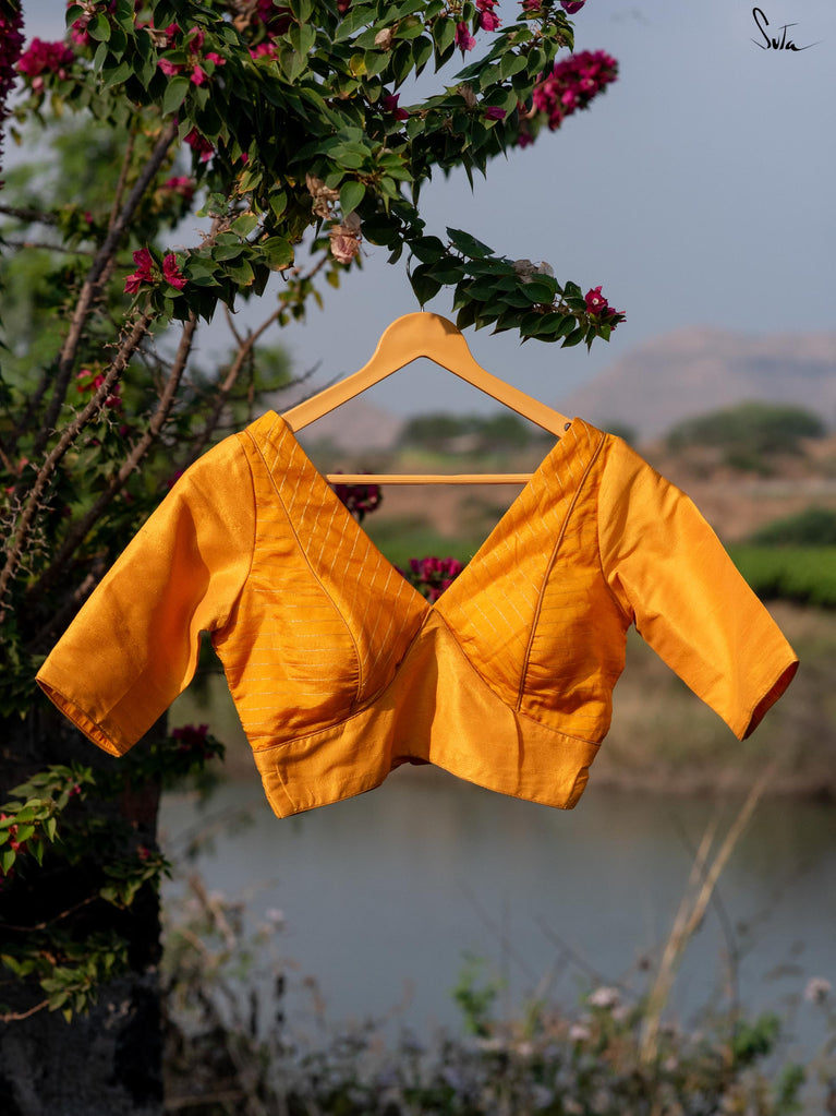 Welcome the sunshine into your wardrobe with our 'Banana Blast' blouse. Crafted from luxurious cotton silk, this yellow beauty features a quirky V-neck design, elbow sleeves, and a comforting back button opening. Drawing inspiration from the beautiful, sunny spring mornings, this blouse revitalizes your fashion with its blooming aura, spreading joy and warmth wherever you go.