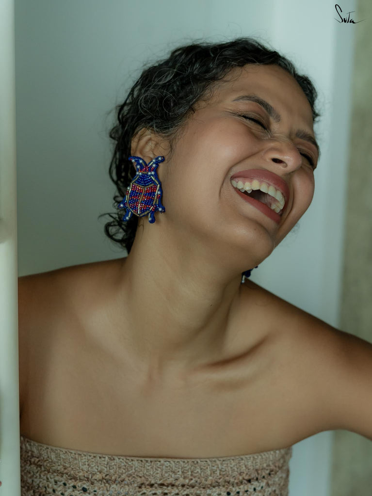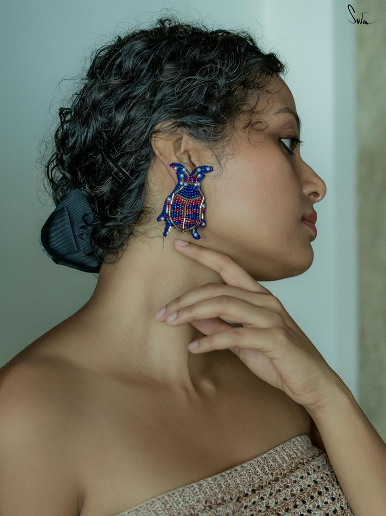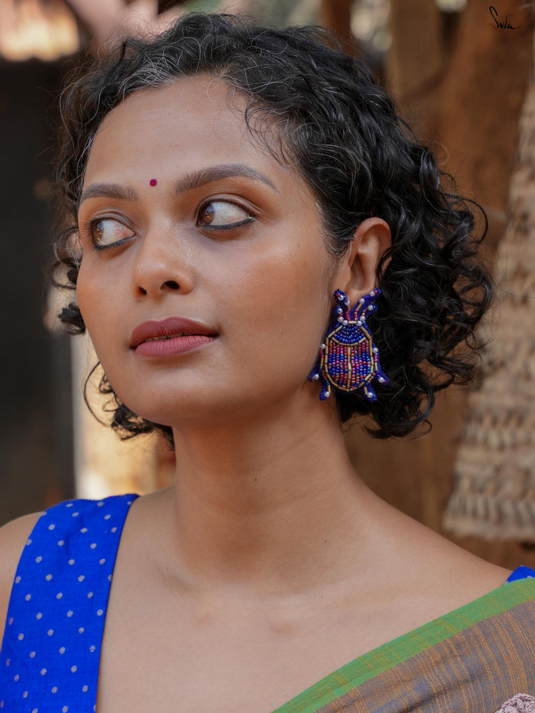 Delve deep into the aura of funky styling with the Affluence earrings, a pair of handcrafted pieces made up of blue and pink shades. These insect-shaped earrings contain zardozi threadwork all over the body and are your perfect companion for every outing due to their unique appearance.