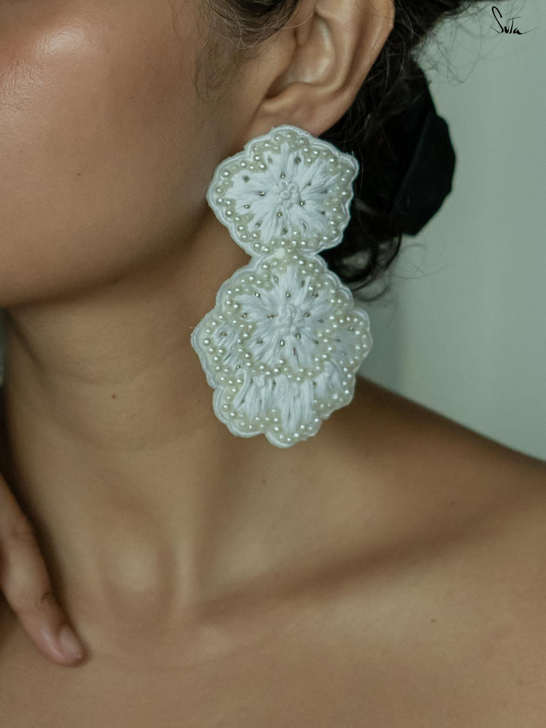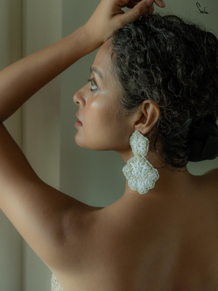 Explore the richness of elegant fashion with the Aristocrat Ear Ring, a statement piece that is handcrafted with a pristine white shade. These floral earrings also contain zardosi threadwork and hand embroidery, painting every look with a stroke of elegance and purity.