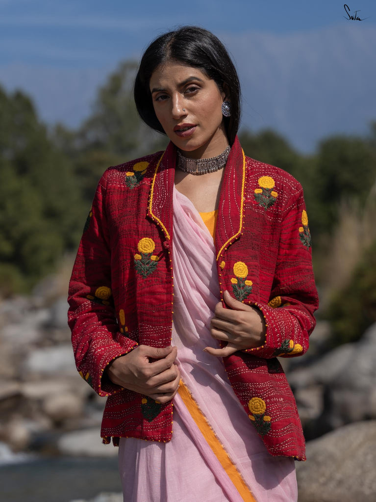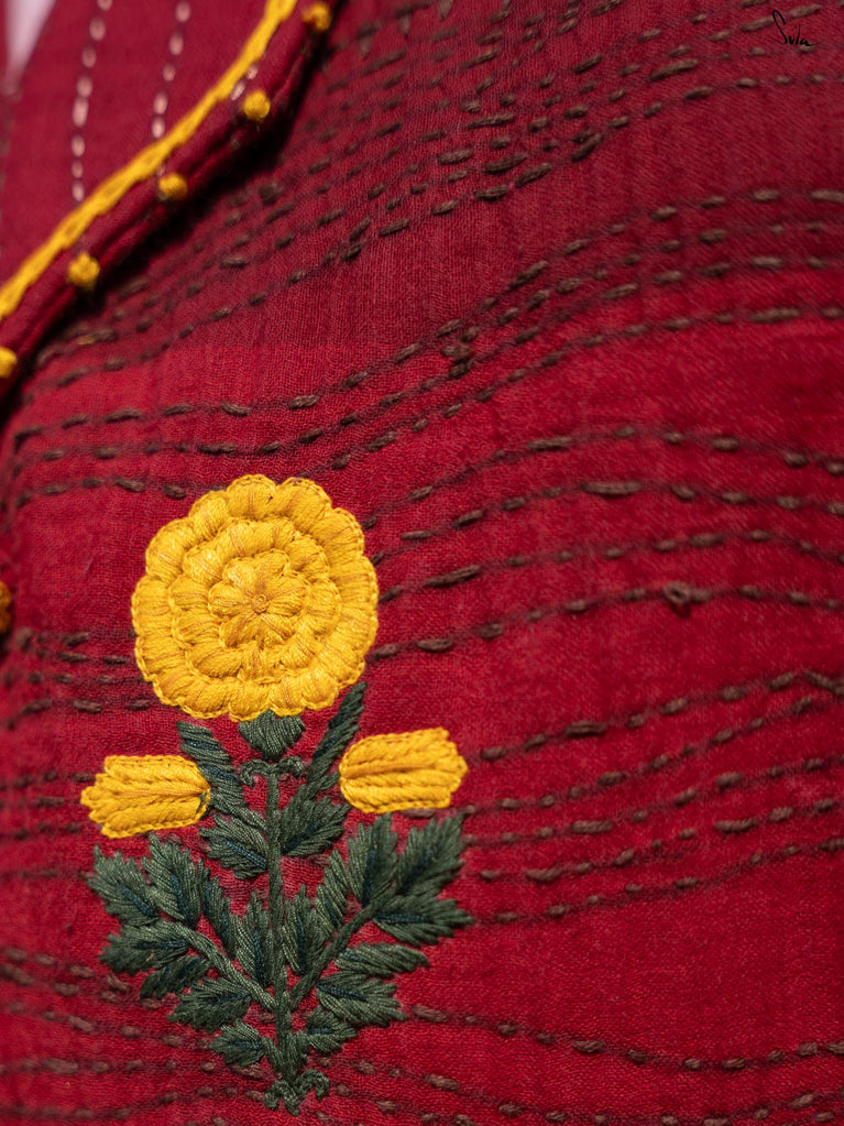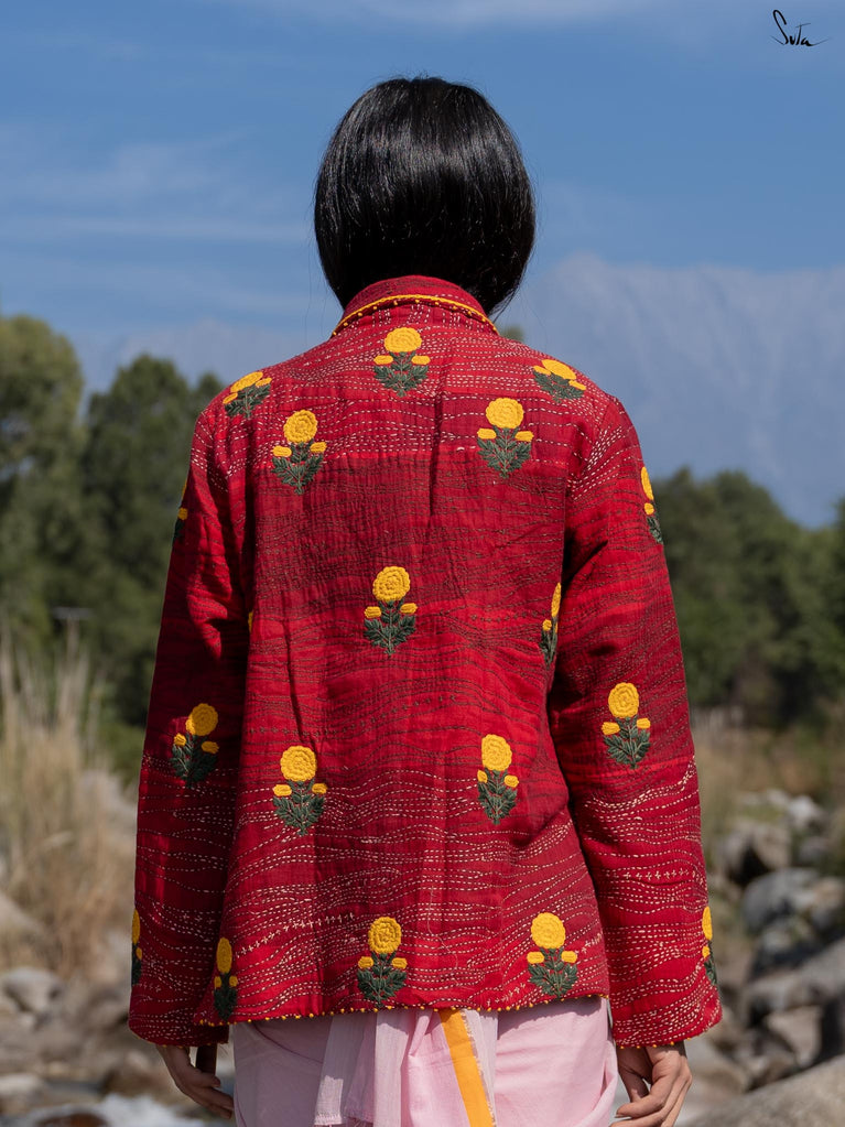 Anisa, like every jacket in the Bageecha collection, is crafted with an incredible amount of time, effort, and heart. The jacket is a stunning mix of red hues, brought to life through careful quilting and traditional Katha running stitches. The vibrant yellow marigold flowers embroidered on the jacket embody the artisans' love for nature and their craft, each stitch meticulously placed. From the careful French knots adorning the cuffs and hem to the yellow chain stitch that traces the collar, every detail tells a story of dedication and attention. The artisans’ hands move with purpose, creating a masterpiece that is a labor of love from start to finish. Each piece passes through the hands of many skilled craftsmen, who imbue it with their love and stories, making it not just a jacket, but a symbol of the beauty and care that goes into every handcrafted garment.