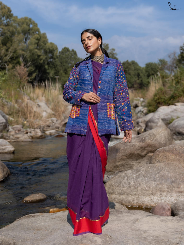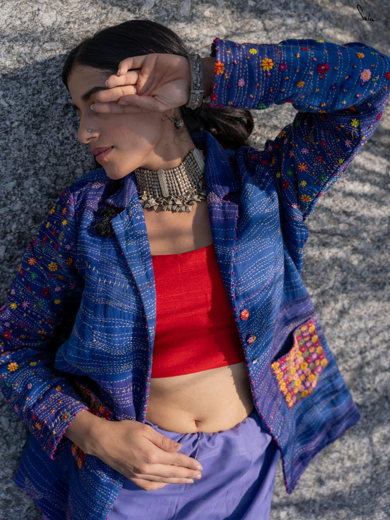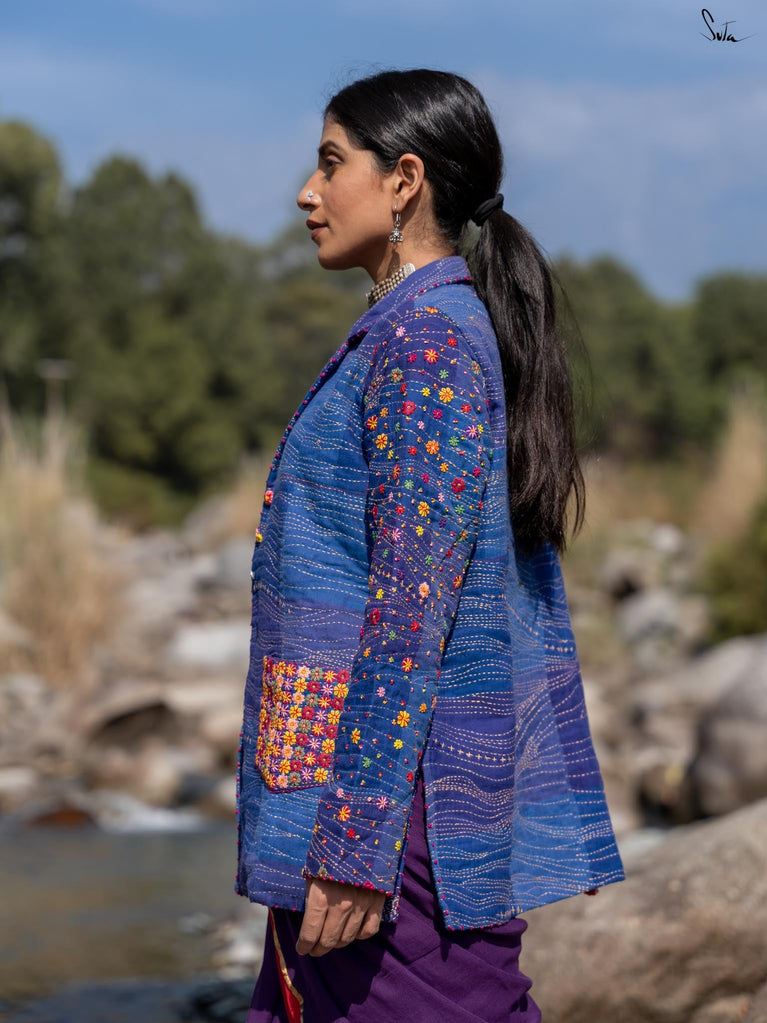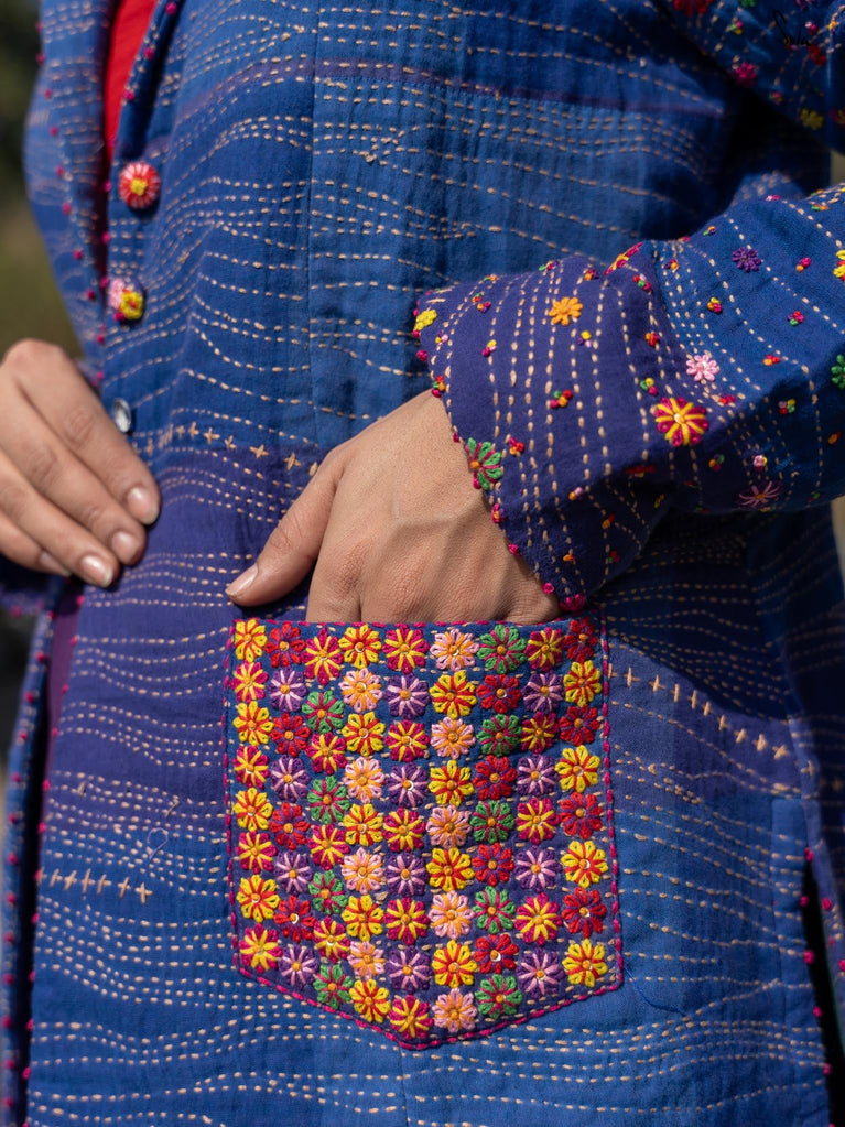 Inspired by the tranquil coastal town of Bardez, this jacket from Suta’s Bageecha collection tells a story of serene blues and vibrant florals. The deep shades of blue, quilted with traditional Katha running stitches, carry the stories of skilled hands passing from one artisan to another. The multicolor floral embroidery on the pockets and sleeves, meticulously hand-stitched, showcases the artistry of our craftsmen who infuse each design with their heart and soul. The pink French knots at the jacket and sleeve hems are a delicate finishing touch, each knot a tiny act of love. The buttons, embroidered with flower motifs, further reflect the care that has gone into this jacket. This creation is more than just a garment; it’s a narrative of tradition, artistry, and the love of our craftsmen that flows through each intricate detail.