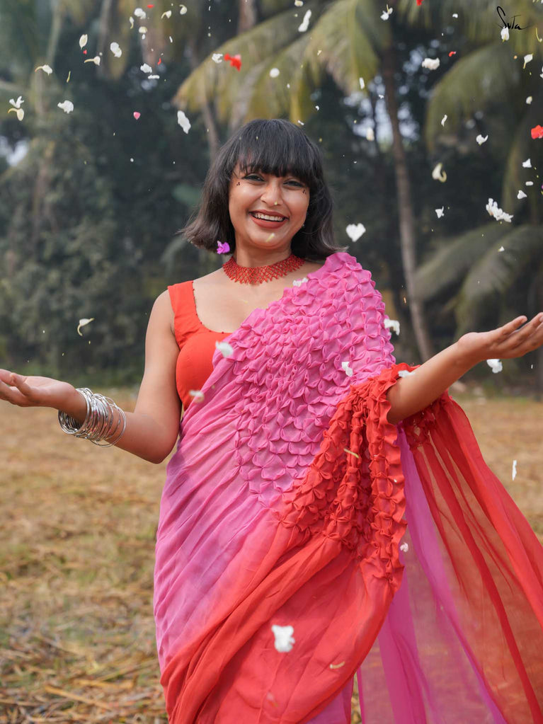 The model is wearing size S blouse and the saree is Dipped in Flowers