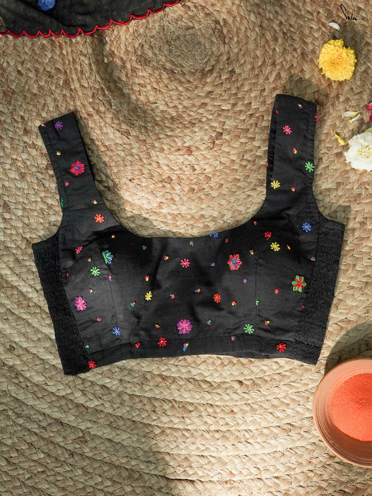 A blouse that blooms with beauty, this black sleeveless cotton piece is adorned with colorful embroidered flowers, capturing the lively spirit of Holi in every stitch. The Elas-Tech fit hugs your body perfectly, letting you move with ease and grace as you celebrate the colors of life. The elastic fabric stretches and molds to your shape, ensuring comfort and flexibility while you revel in the festivities. This blouse isn’t just a piece of clothing, it’s a moment, a memory, woven with floral joy. For the best fit, shop one size below, as the Elas-Tech expands and adapts to your body perfectly.