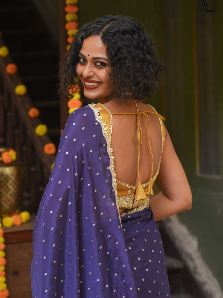 Rich & striking - this purple viscose-blend saree brings depth and elegance to every celebration. The smooth drape is adorned with light gold woven buttis that add a soft, luminous sparkle. Finished with an embroidered scallop lace, it carries a refined yet celebratory feel, perfect for evening weddings, receptions, and special family events.