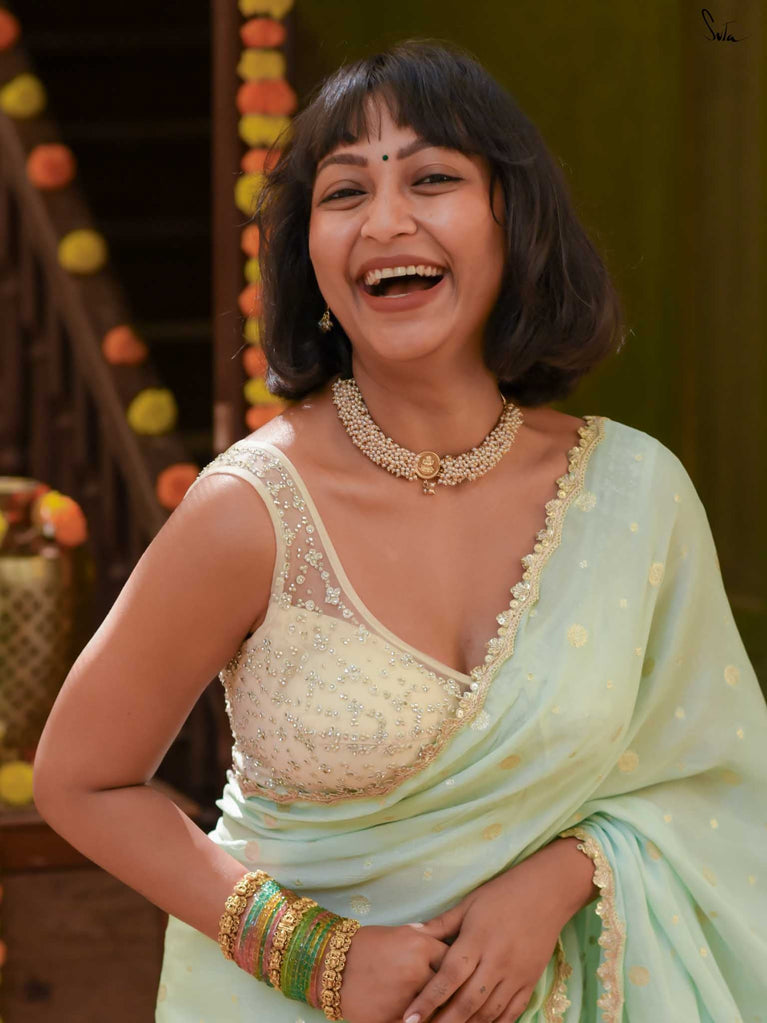 The model is wearing size S blouse and the saree is Dipped in Dreams