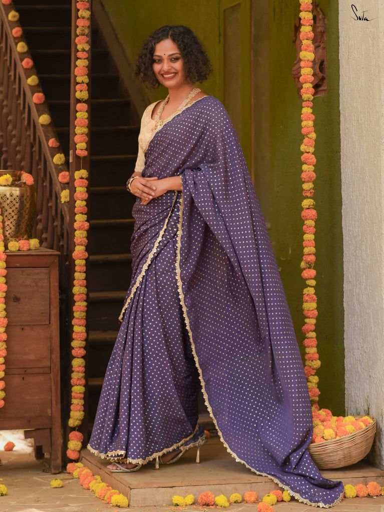 Deep, refined, and effortless - this navy blue viscose-blend saree brings a rich elegance to every occasion. The smooth, fluid drape is dotted with light gold woven buttis, adding a soft glow against the dark base. Finished with an embroidered scallop lace, it carries a polished, timeless charm perfect for evening weddings, receptions, and celebratory gatherings.