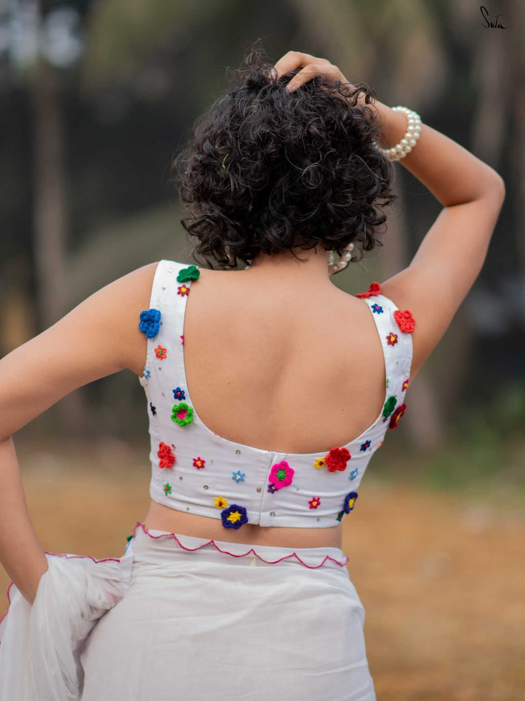 This white sleeveless cotton blouse is a floral fantasy, woven with the delicate magic of 3D crochet flowers. A symbol of blossoming joy, it hugs your body with the comfort of Elas-Tech, adapting to your shape like the festival itself, full of surprises. The 3-inch elastic shirring on both sides allows this blouse to stretch and move with you, providing both style and flexibility. The softback hook opening and U-neckline create a graceful, flattering fit, while the vibrant flowers dance like colors in the air. Wear it, and let the celebration begin. Shop one size below as it expands to fit your shape beautifully.