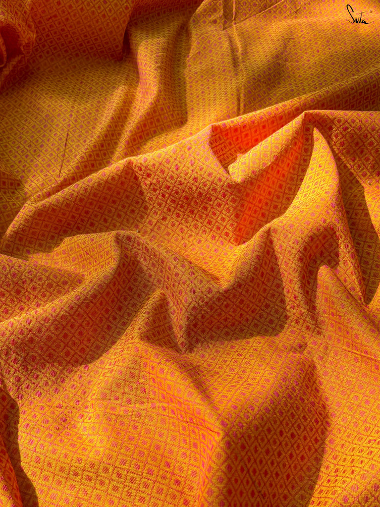 Soft & graceful - this baby pink viscose-blend saree brings a gentle elegance to every occasion. The smooth drape is sprinkled with light gold woven buttis, adding a subtle glow that enhances its pastel charm. Finished with an embroidered scallop lace, it offers a delicate, refined look perfect for daytime weddings, pre-wedding rituals, and intimate celebrations.
