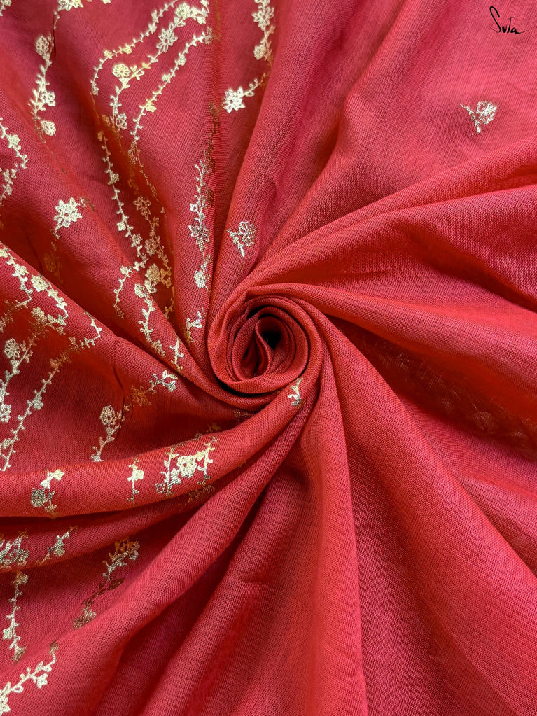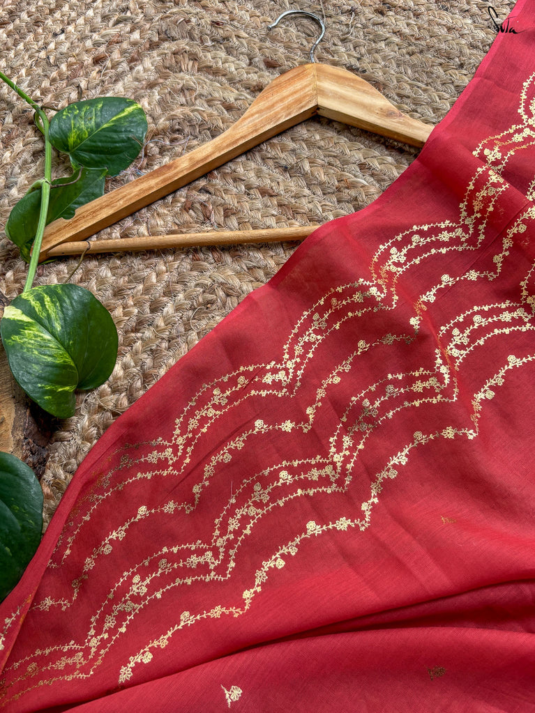 Like the melody it’s named after, Thumri flows with quiet grace and deep emotion. Draped in a rich wine hue, this cotton-silk saree carries an intricate floral jaal woven in soft, dull gold - a gentle nod to timeless opulence. Light as a whisper yet regal in presence, it’s perfect for moments that call for understated celebration.