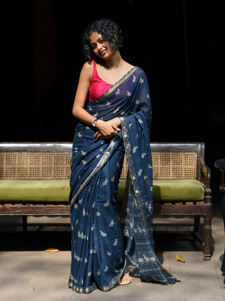 An olive green saree that feels grounded and graceful. The colour carries a sense of calm confidence and earthy charm. The geometric dobby border adds definition and style, keeping the look elegant and festive. Perfect for celebrations that call for subtle sophistication. Comes with a matching blouse piece, no fall.