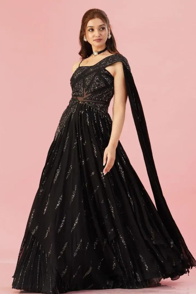 Make a bold statement in this black net saree featuring a heavy stitched blouse in self-color cutdana work. The elegant jaal design on the pallu adds depth and drama—perfect for evening parties, receptions, or festive occasions.