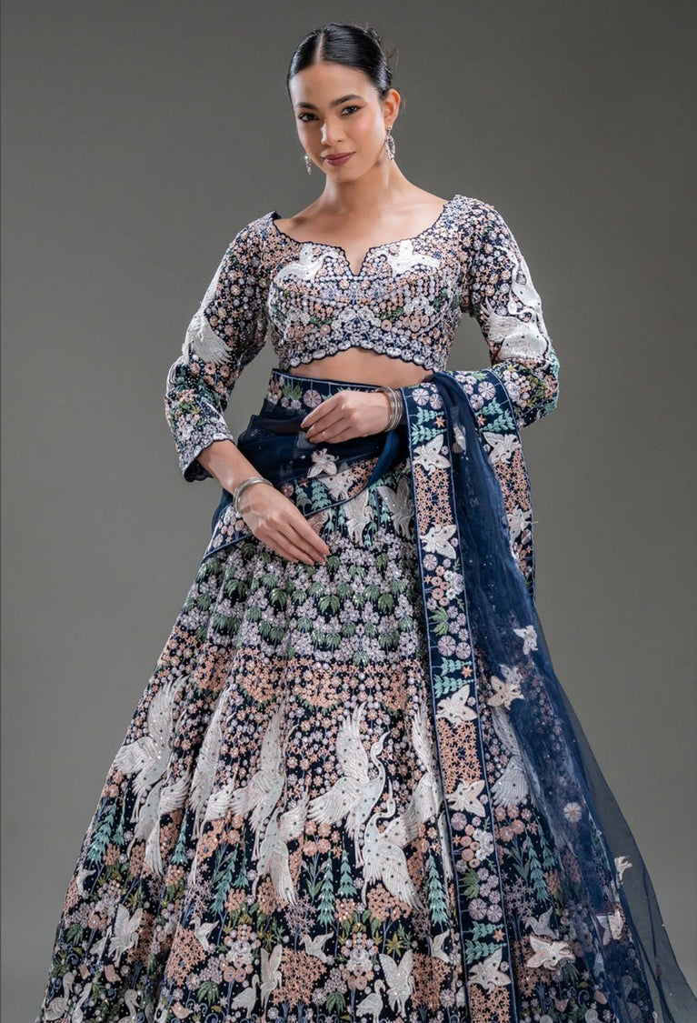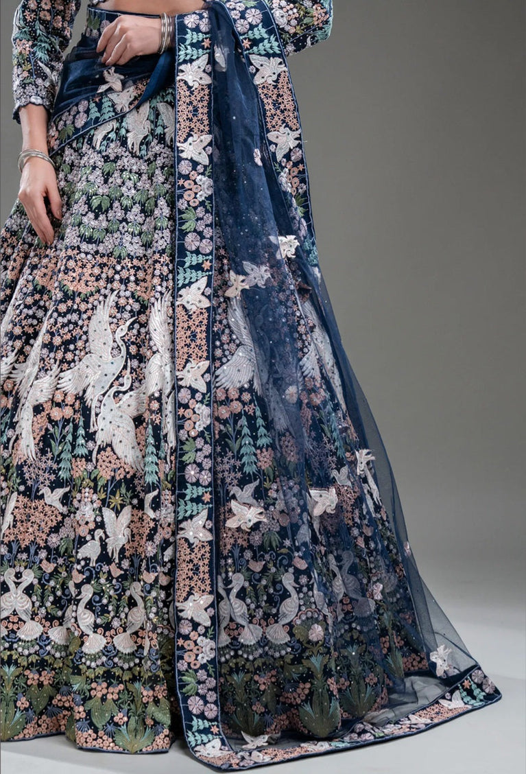 Make a statement in this blue net lehenga, beautifully detailed with white peacock motifs and intricate mixed jarkan embroidery. Finished with a heavy four-sided embellished dupatta, this ensemble blends regal charm with refined craftsmanship—perfect for weddings, receptions, and festive celebrations.