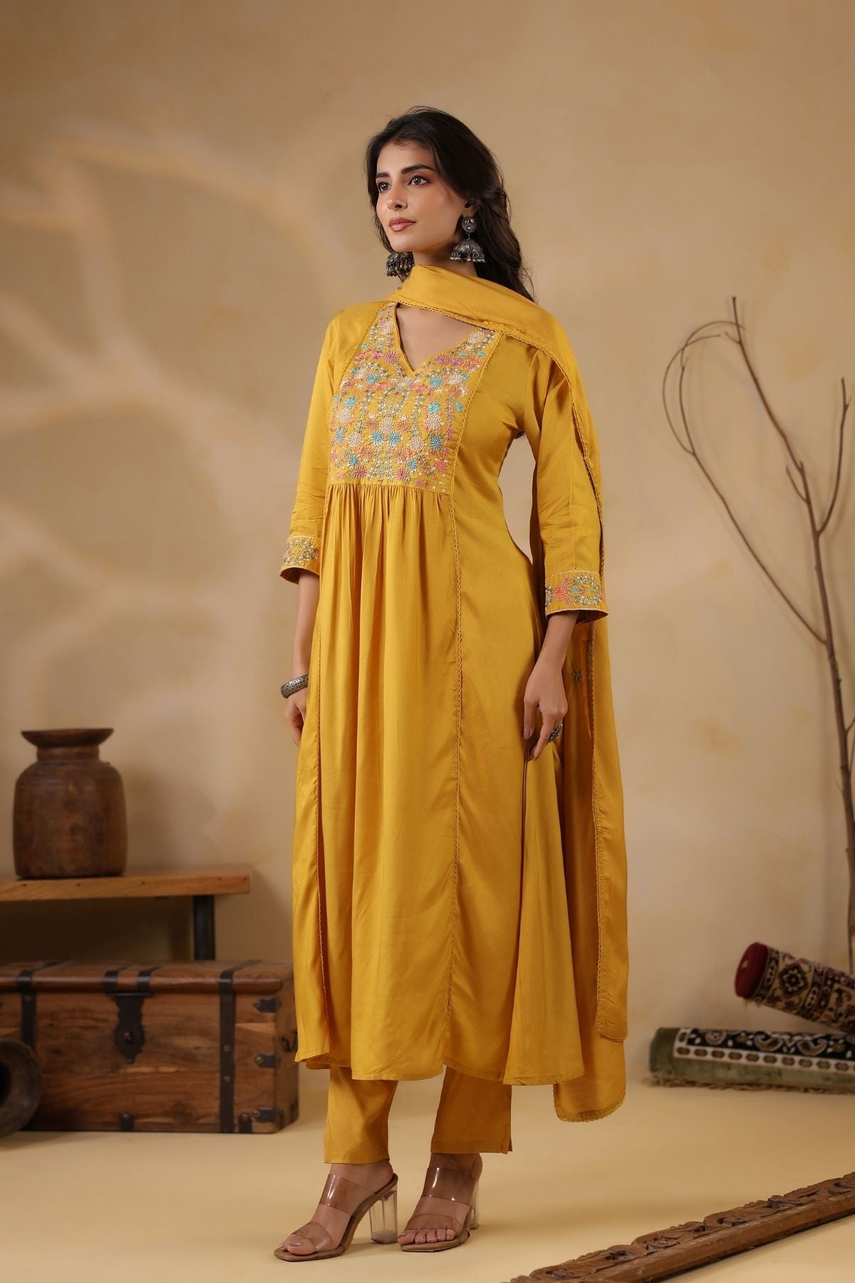 Elevate your festive style with this Designer Kurti with Light Embroidery in a rich mustard hue. Featuring delicate threadwork and a traditional kurta set design, it’s perfect for celebrations, family gatherings, or cultural events.