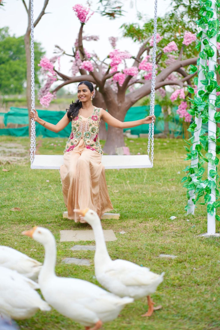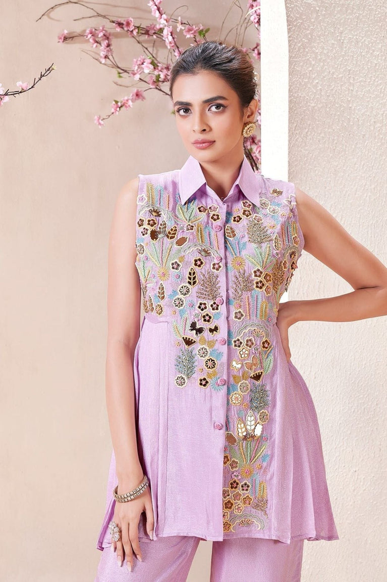 This designer Indo-western outfit features a multicolor embroidered short kurta paired with flared pants. The playful silhouette, vibrant detailing, and modern cut make it perfect for mehendi functions, festive gatherings, or intimate celebrations.