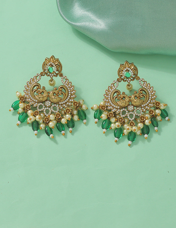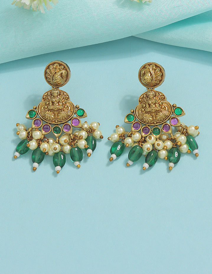 The Designer Lakshmi Devi Necklace Set features beautiful green beads and a detailed peacock design. This elegant set adds a traditional touch to any outfit, perfect for special occasions.