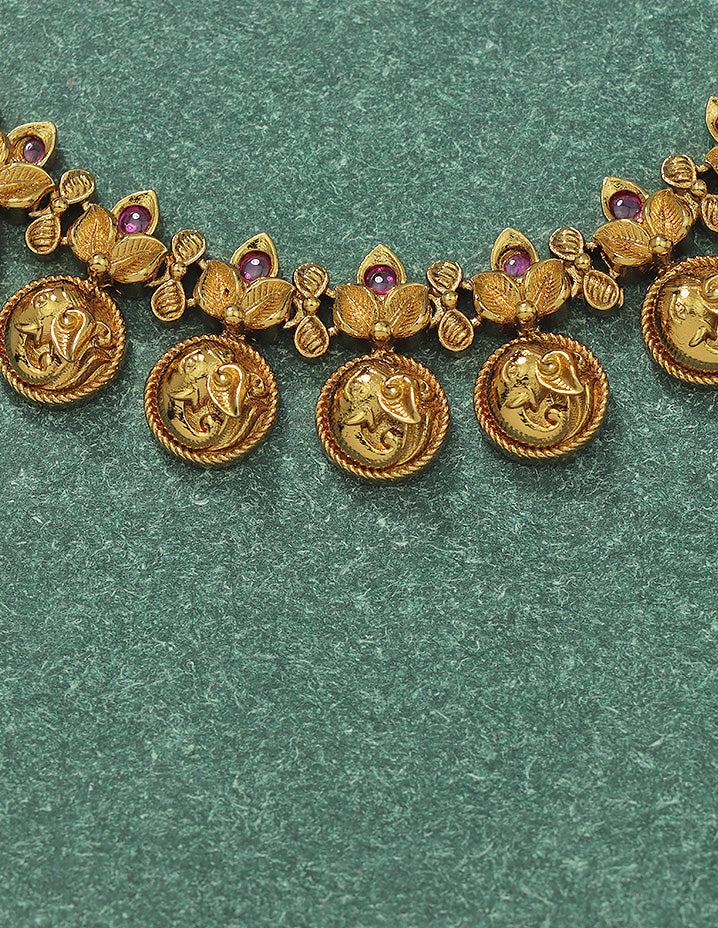 Embrace classic elegance with the Divine Heritage Coin Set, adorned with intricately embossed antique-style coins and paired with matching earrings—perfect for a timeless traditional look.